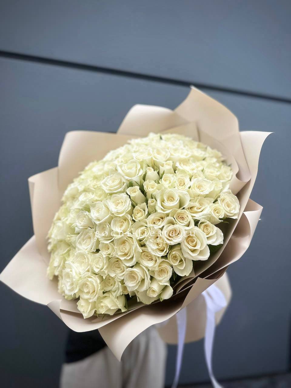 Сто один бутон сорта Athena собраны в монохромную композицию безупречной формы. Белый цвет раскрывается во всей своей чистоте, создавая впечатление спокойной уверенности.
