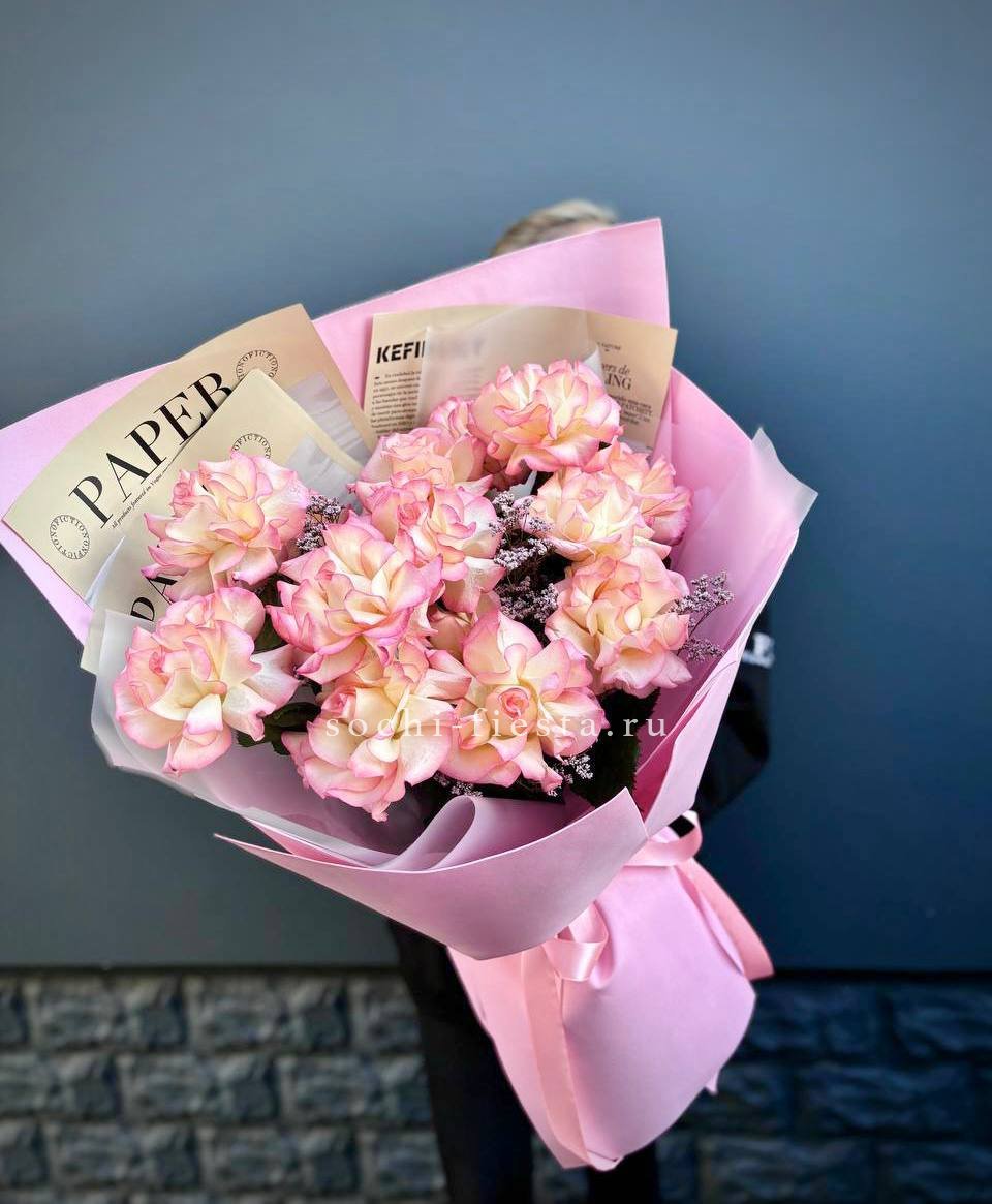 15 роз сорта джумилия, лента, дизайнерская упаковка.