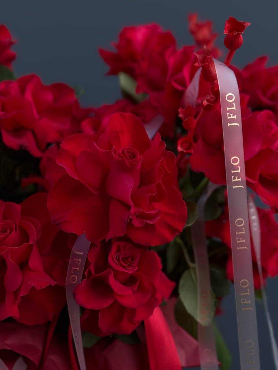 Двадцать одна роза глубокого красного оттенка собрана в плотную композицию с бордовым амарантом и натуральными сухоцветами. Насыщенность цвета создает выразительный образ, а округлая коробка сохраняет форму и свежесть бутонов надолго.