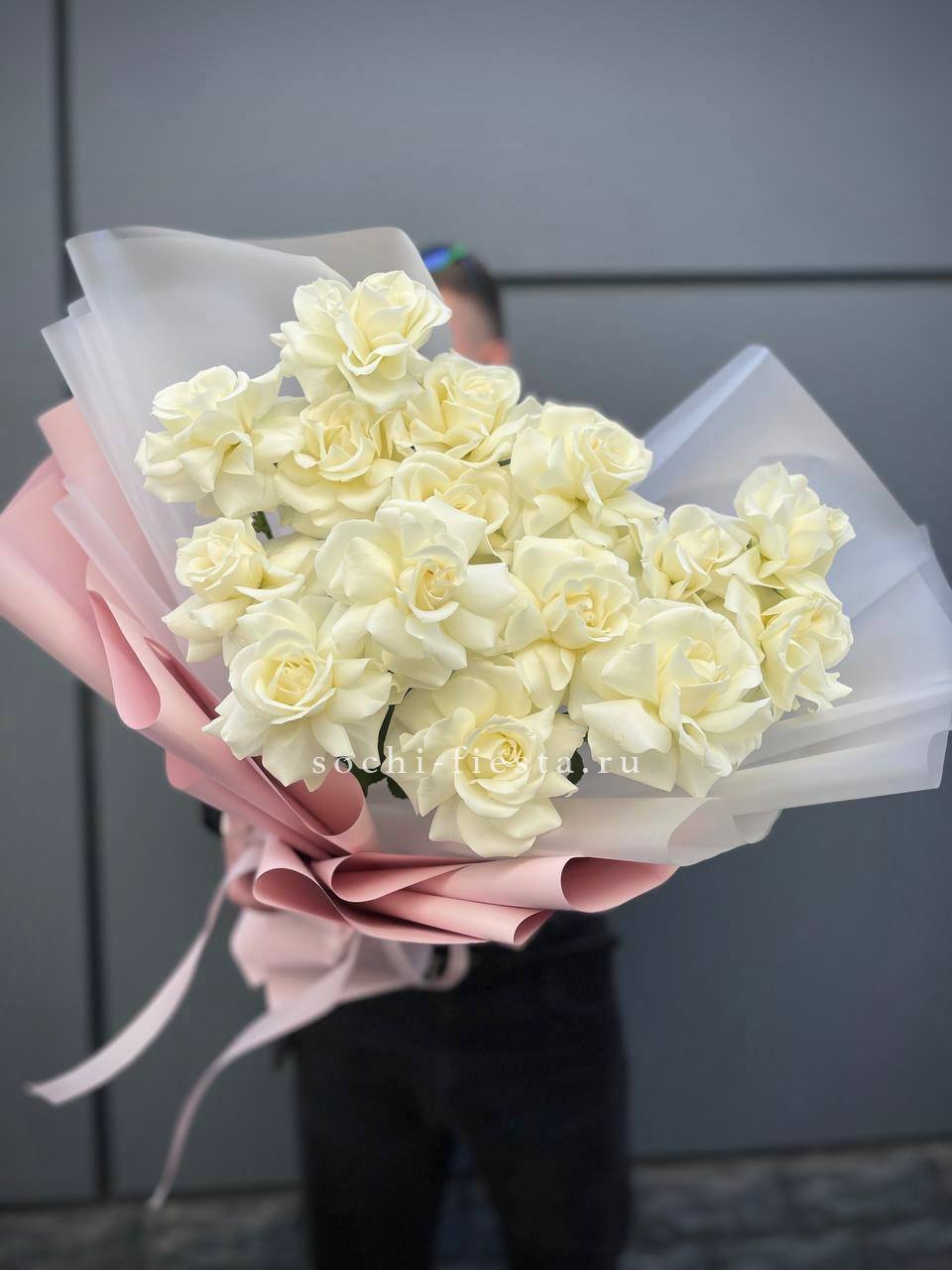 Тридцать пять белых роз образуют объемную композицию с выразительным силуэтом. Светлая упаковка поддерживает воздушность и графичность линий.