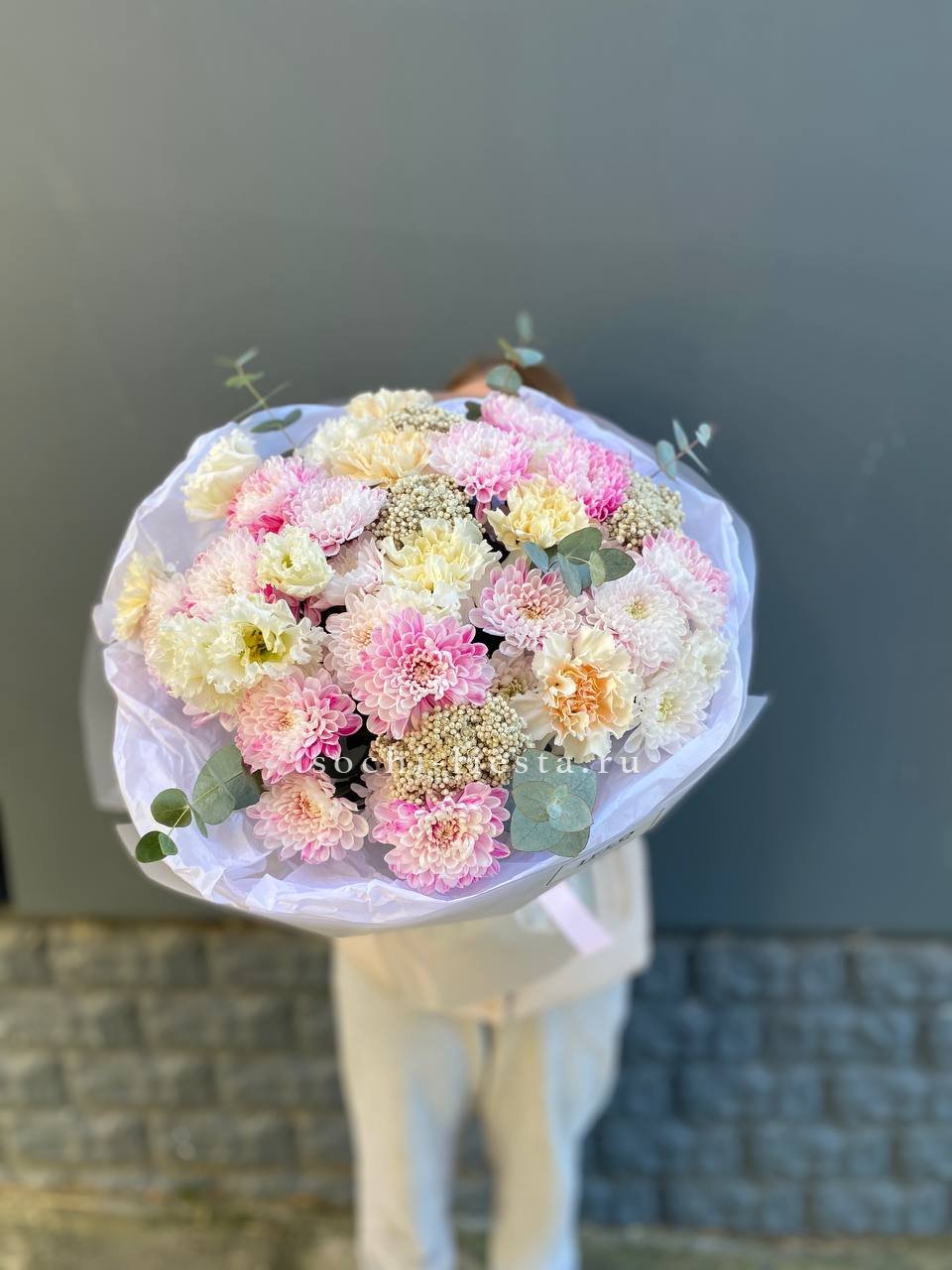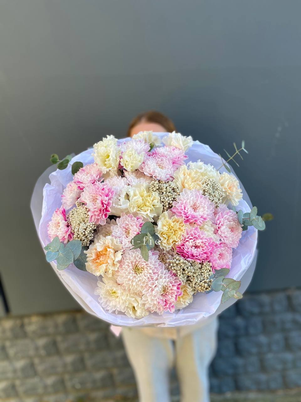 Пышные бутоны Сара Бернар раскрываются среди лепестков роз и воздушной гортензии. Эустома добавляет графичности, а эвкалипт собирает композицию в единый силуэт. Цветовая гамма плавно перетекает от розового к голубому.