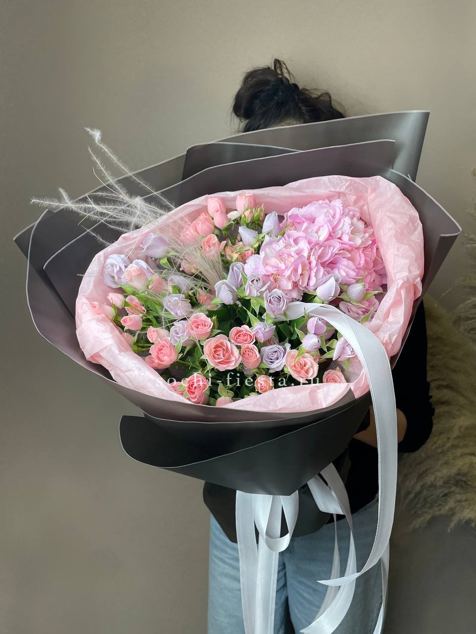 Лавандовые оттенки переходят в персиковые и розовые полутона. Гортензия создаёт пышную основу, а эустома и герберы расставляют яркие акценты. Композиция выглядит воздушно и свежо.