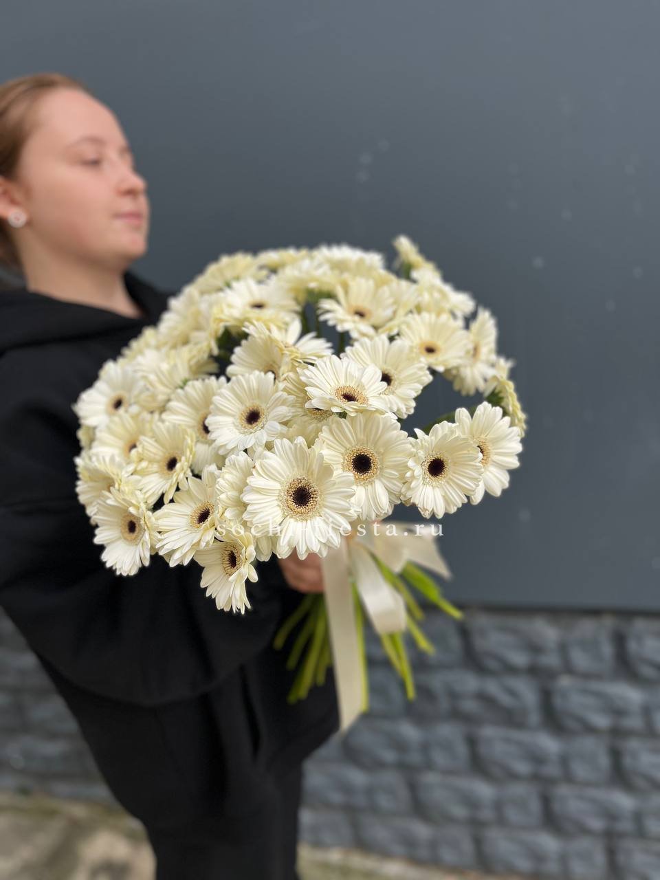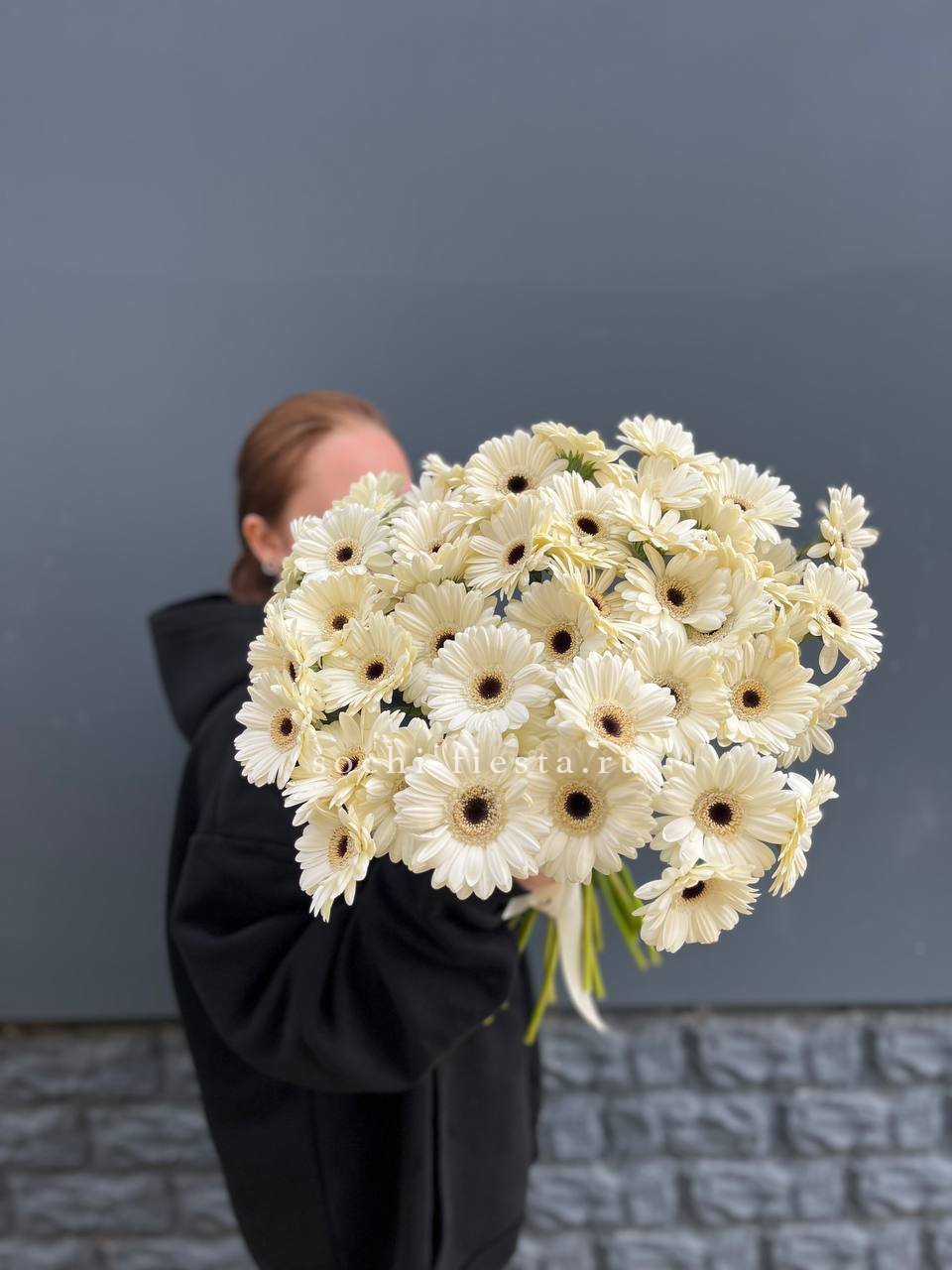 Пятьдесят один бутон под лентой — это объём и яркое присутствие в любом помещении. Герберы выстроены плотно, образуя впечатляющую композицию. Такой букет сложно не заметить.