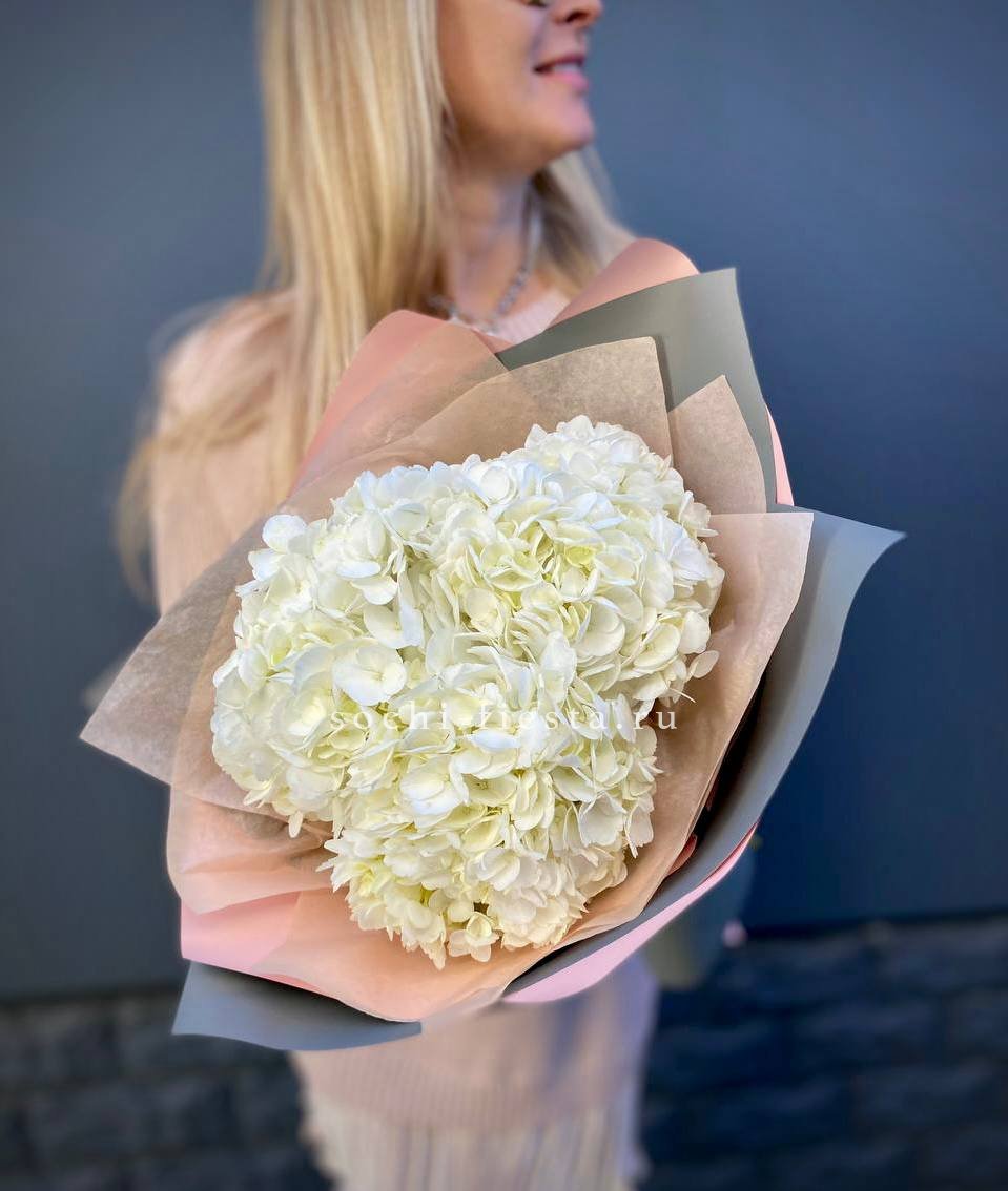 Двадцать одна гортензия разных оттенков собрана в пышную охапку с мягкими переходами цвета. Шаровидные соцветия создают плотную текстуру, а их природная стойкость позволяет наслаждаться букетом долго.