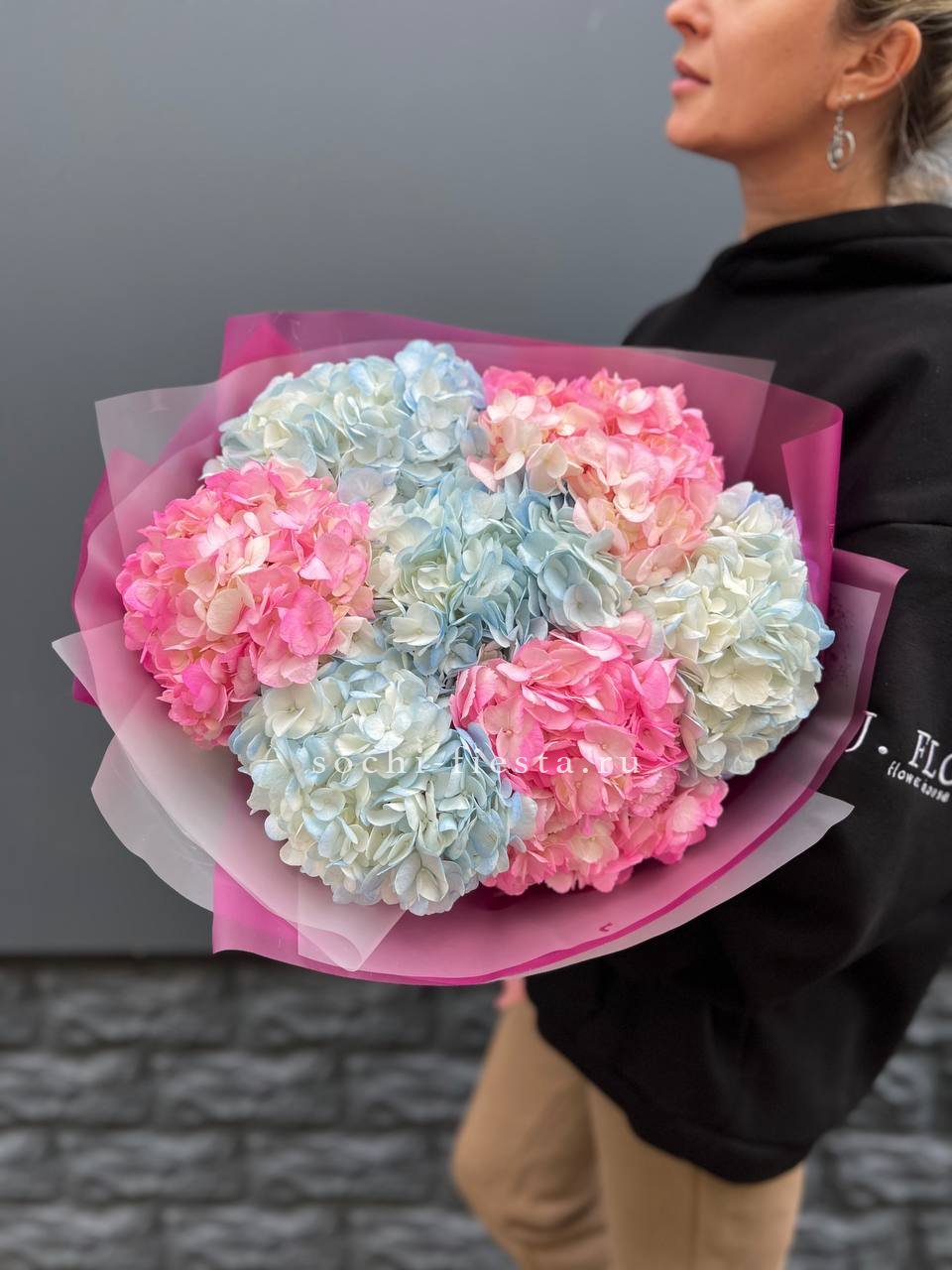 Двадцать пять соцветий гортензий разных оттенков формируют пышное облако с естественной игрой цвета. Каждая головка раскрывается по-своему, создавая живую фактуру без четких границ между тонами.
