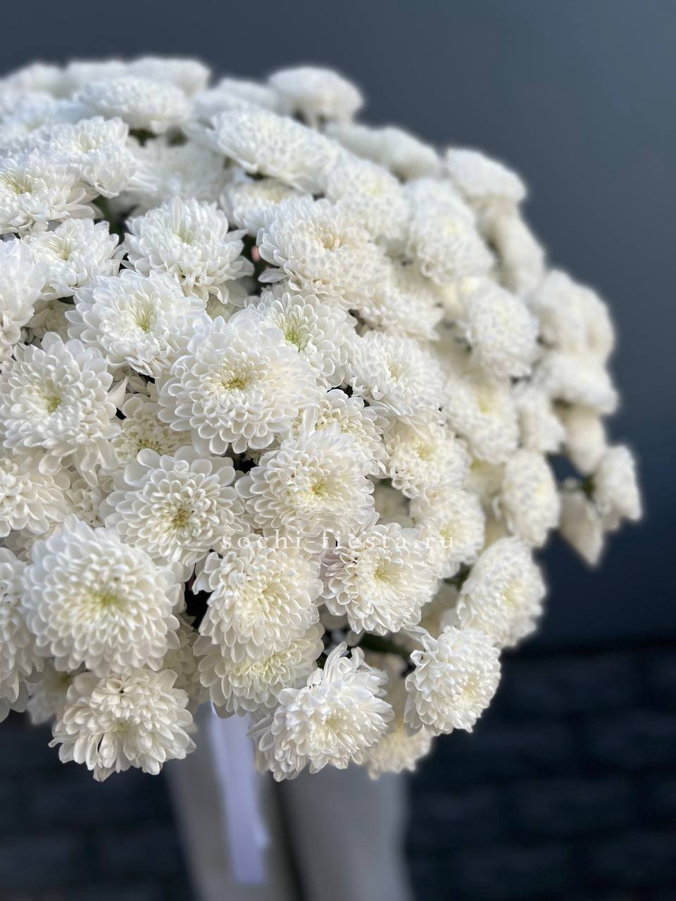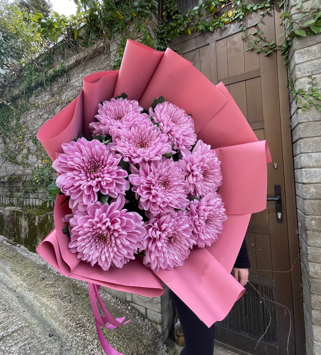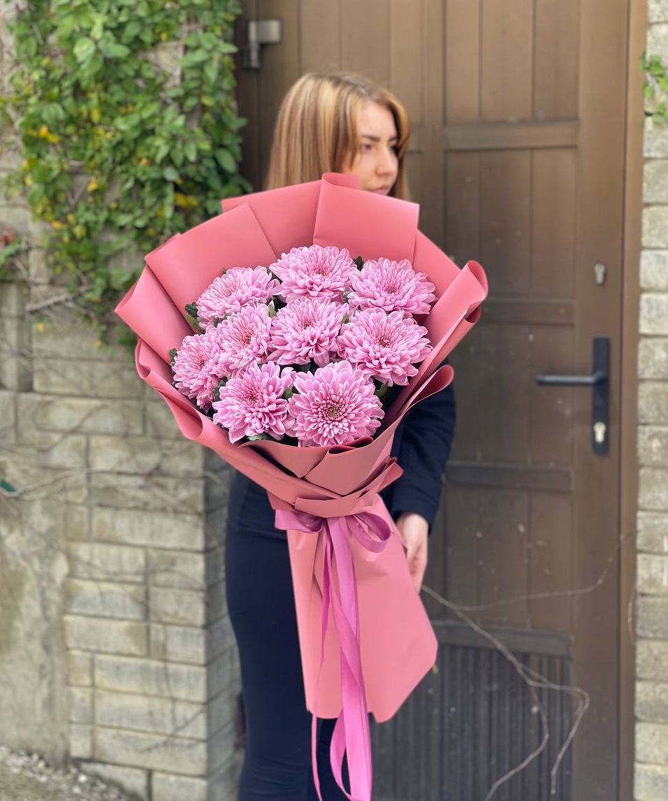 Девять кустовых хризантем собраны в плотный круглый силуэт. Каждая ветка раскрывается веером мелких соцветий, создавая объёмную текстуру. Букет держит форму и выглядит графично.