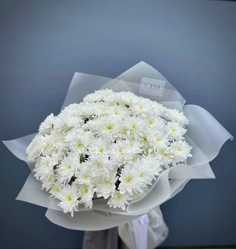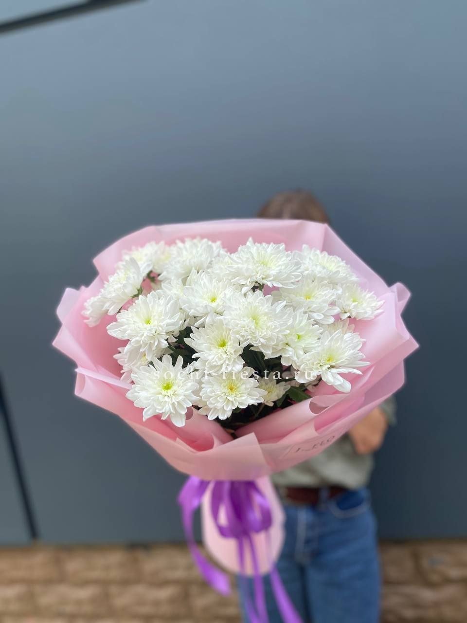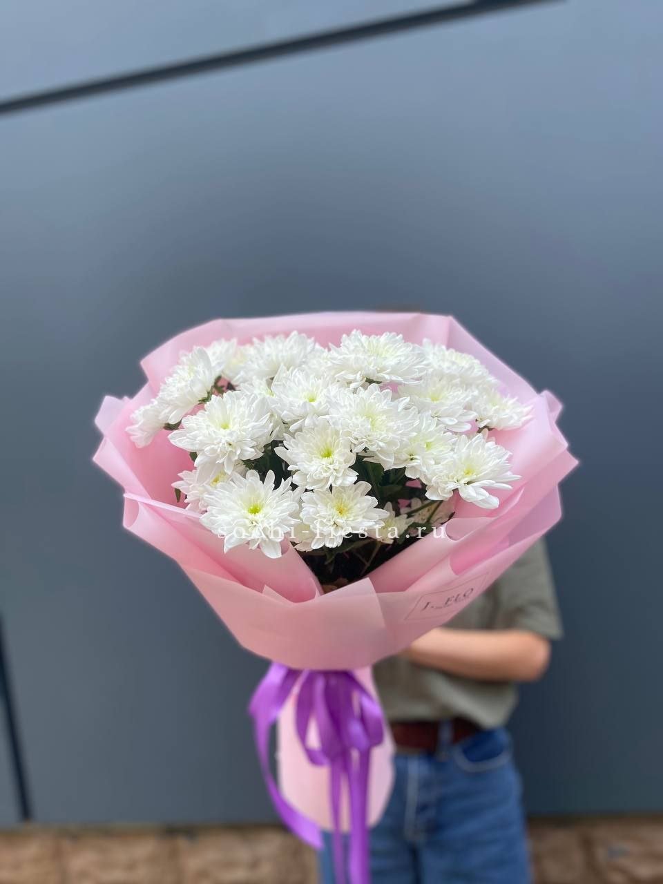 Пятнадцать веток кустовых хризантем с множеством бутонов создают пышную композицию с воздушной фактурой. Оформление из фоамирана добавляет букету завершенность и мягкий силуэт.