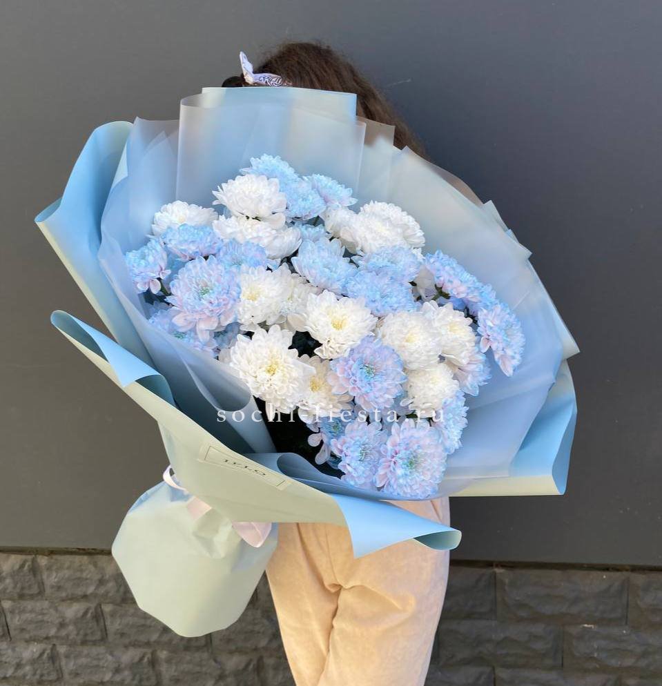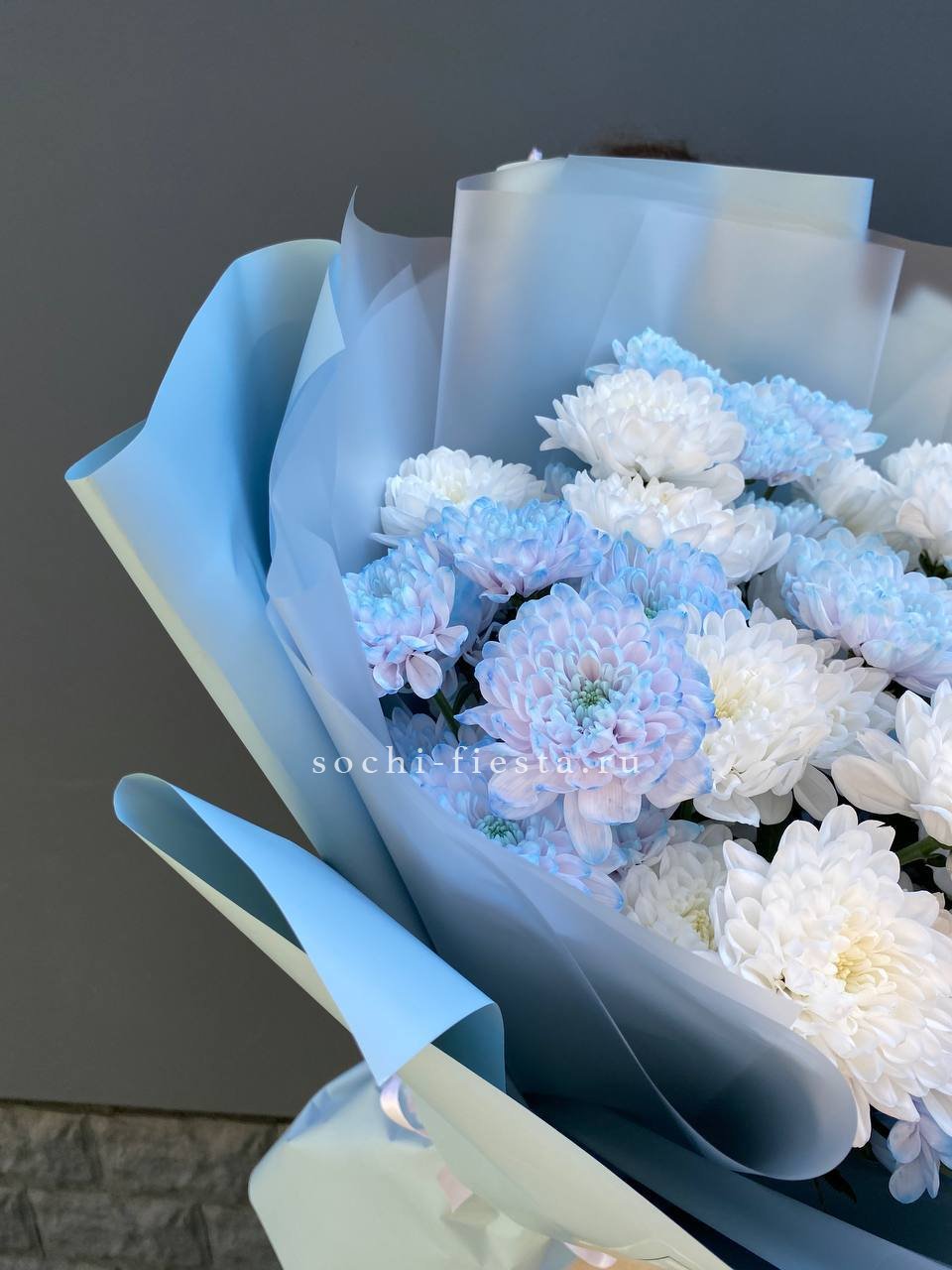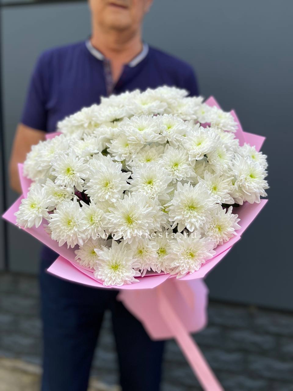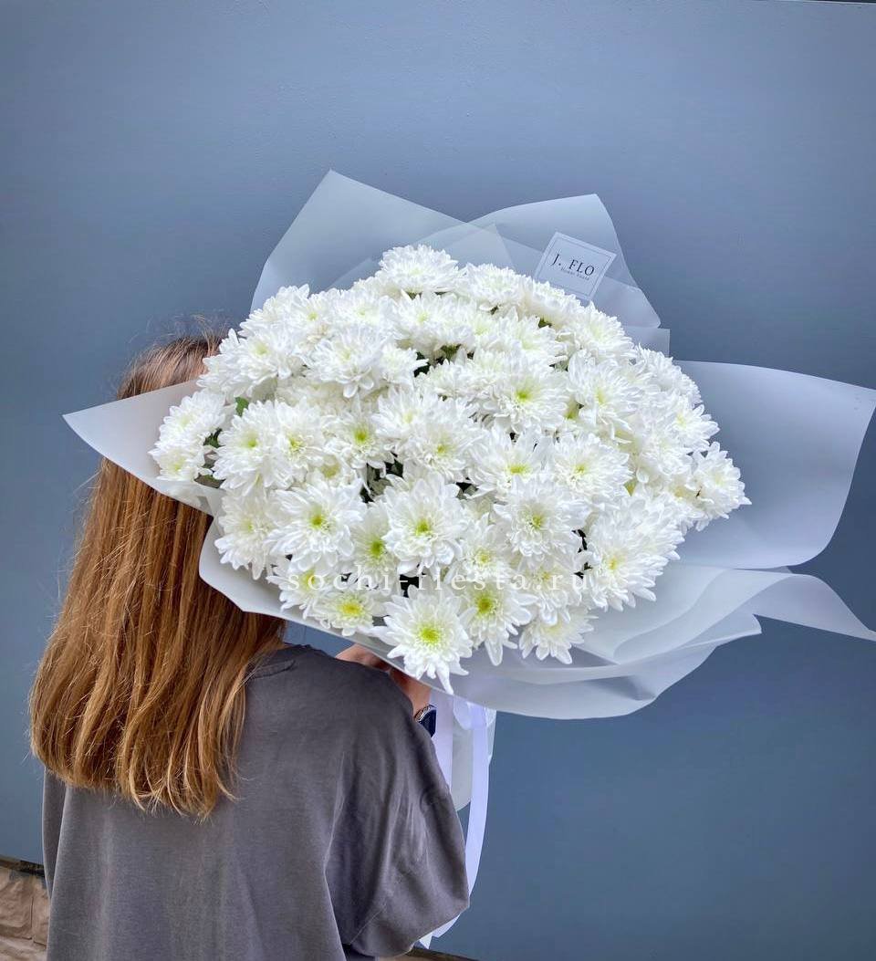 Пятнадцать веток кустовых хризантем с множеством бутонов создают пышную композицию с воздушной фактурой. Оформление из фоамирана добавляет букету завершенность и мягкий силуэт.