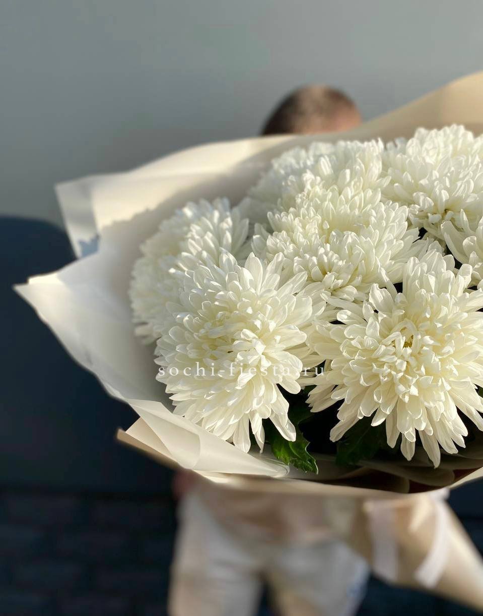 Семь крупных соцветий хризантем с пышными лепестками образуют округлую форму. Бутоны раскрыты полностью, демонстрируя многослойную структуру и живую фактуру каждого цветка.