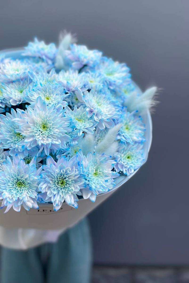 Девять веток кустовой хризантемы в пастельном голубом тоне дополнены пушистым лагурусом. Мягкая цветовая гамма и воздушная текстура создают спокойное визуальное впечатление.