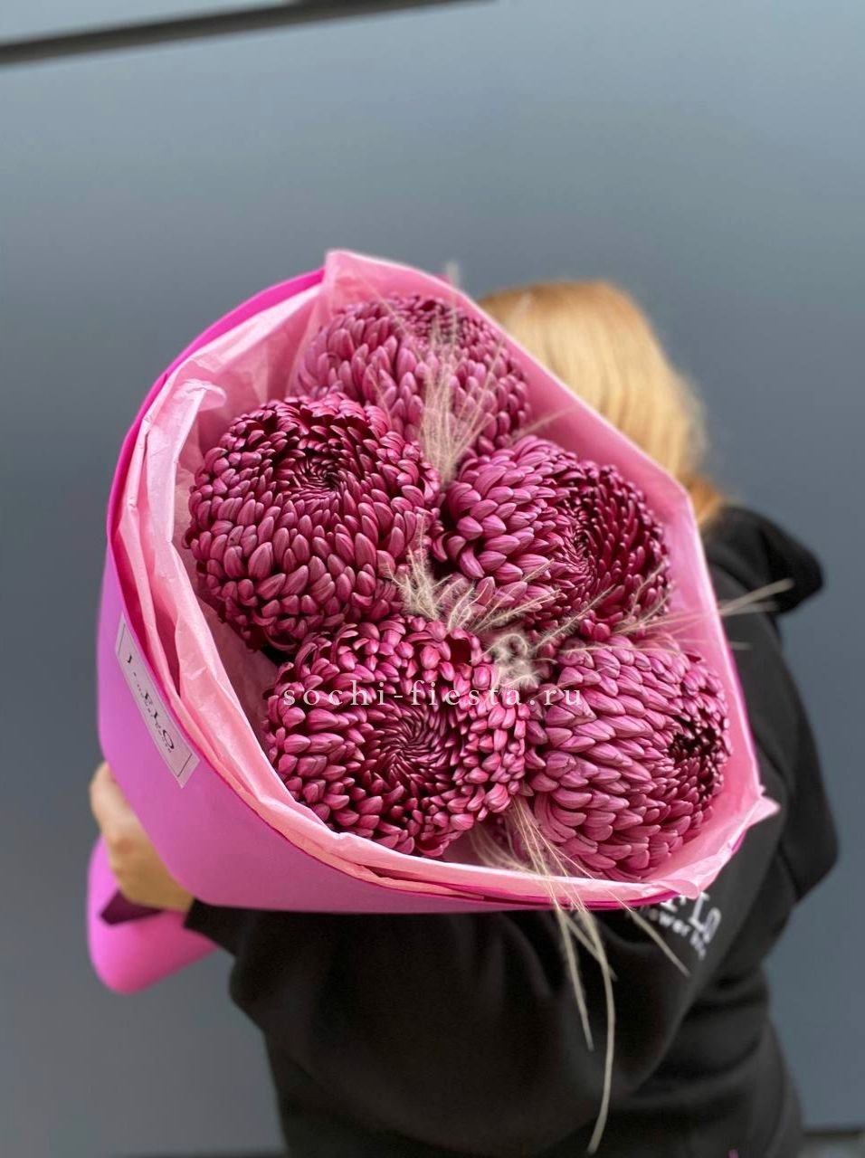 хризантемы Бигуди - 5, стифа (аналог по сезону),  лента, дизайнерская упаковка.
