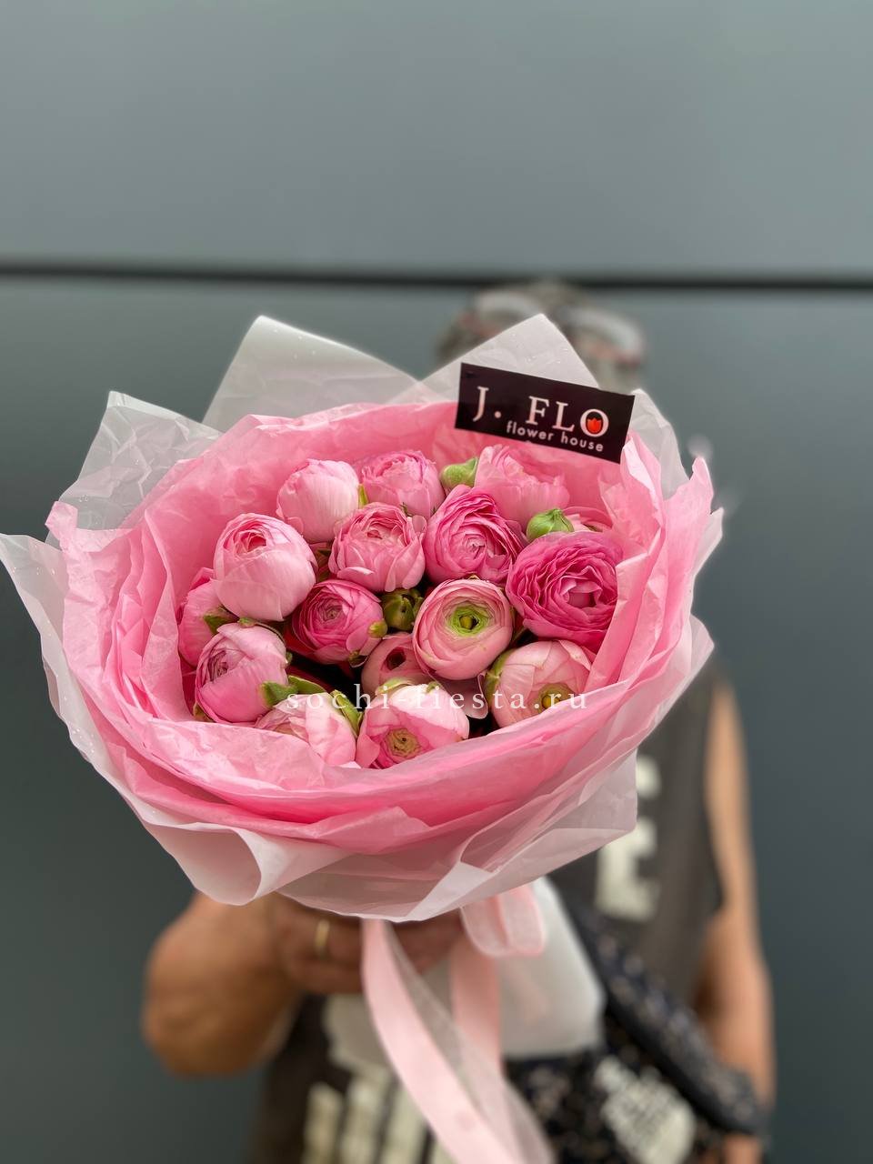 Пятнадцать розовых ранункулюсов раскрываются пышными головками с множеством лепестков. Монобукет выглядит объёмно и заполняет пространство живым цветом.