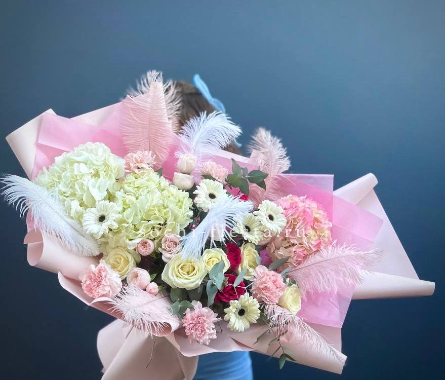 Пышные шапки гортензии переплетаются с бархатными бутонами пионовидных роз, создавая объёмную композицию насыщенного розового оттенка. Орхидеи и эустома добавляют воздушности, а диантус расставляет яркие точки. Букет заполняет пространство и притягивает взгляд своей плотной структурой.