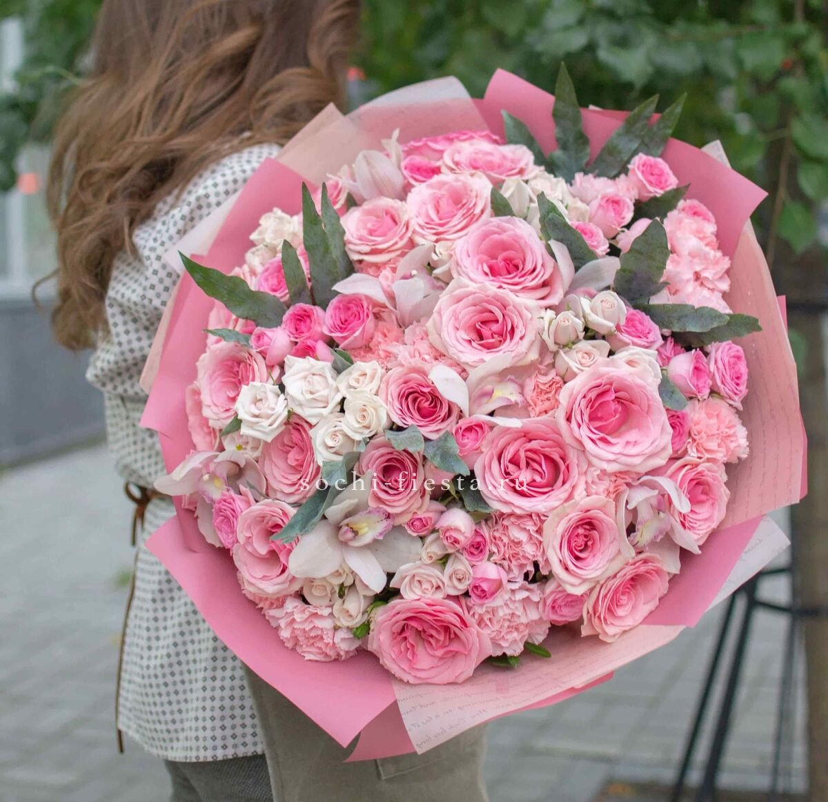 гортензия, диантус, кустовая пионовидная роза, эустома, орхидеи (или аналог), эвкалипт, лента, дизайнерская упаковка.