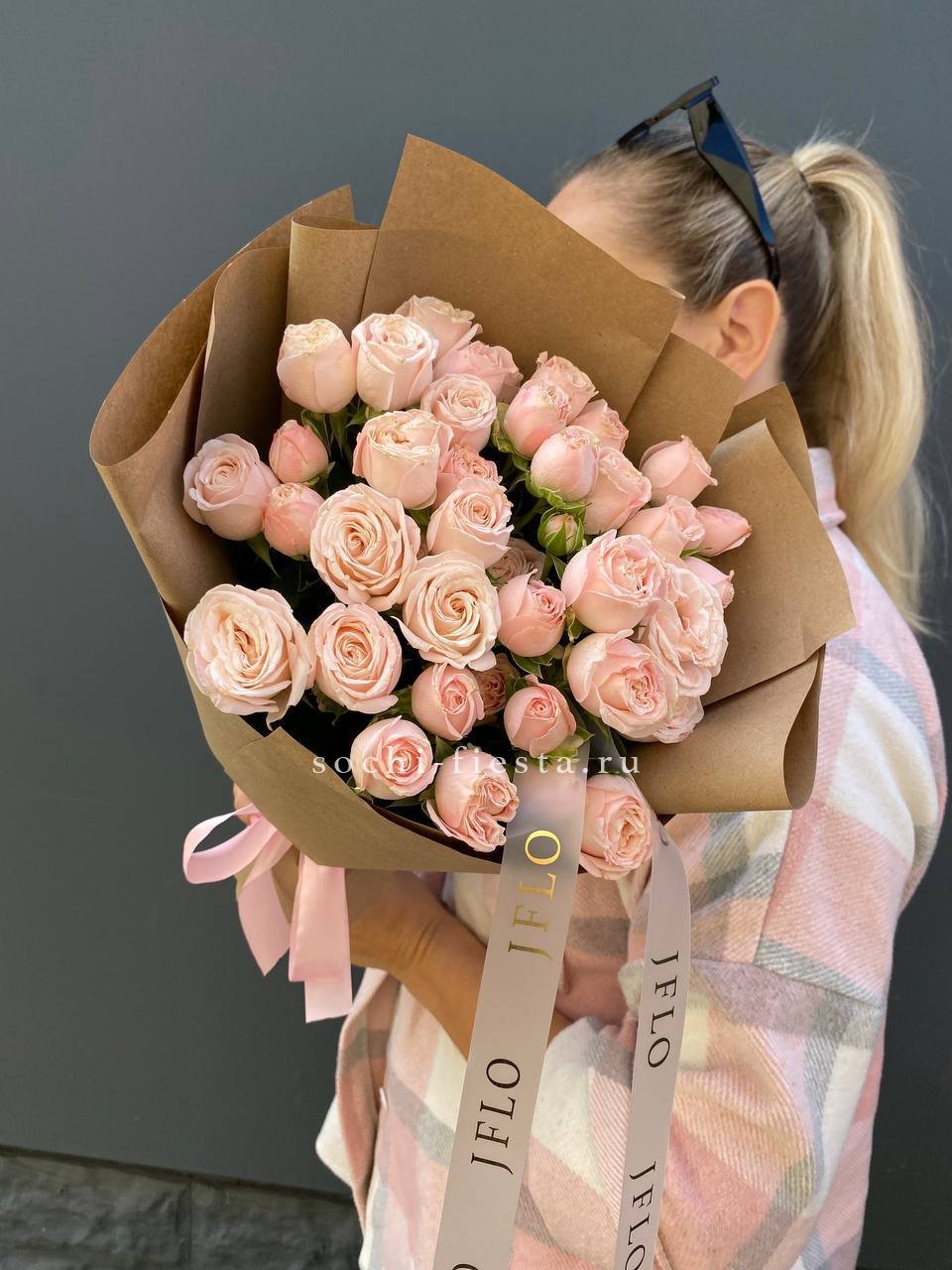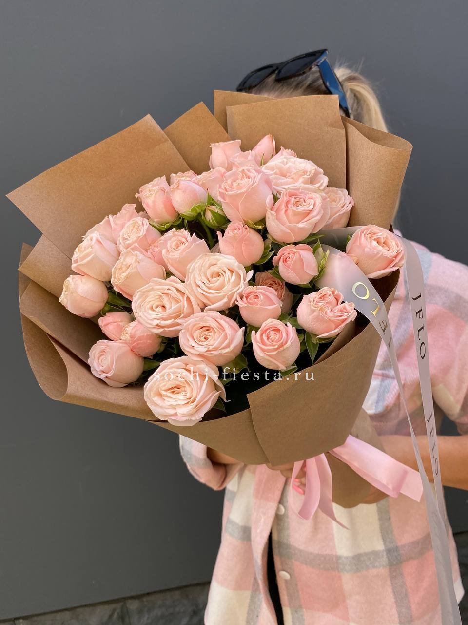 розы, пионовидные кустовые розы, диантусы, эвкалипт, лента, дизайнерская упаковка.