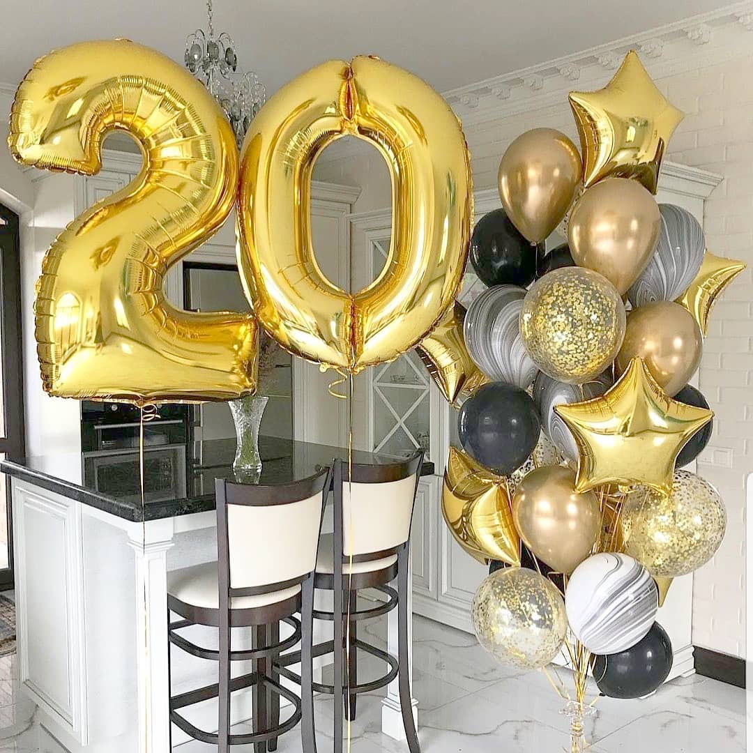 фонтан из 15 гелиевых шаров золотых, серебряных и чёрных оттенков с грузиком. Все шары мы предварительно обрабатываем специальным составом Highfloat, обеспечивая им длительный срок полета.