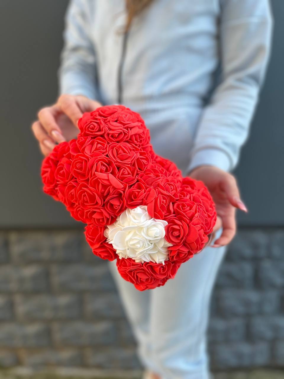 Красный медведь из фоамирана с объёмным белым сердцем в центре. Мягкие ровные ряды лепестков создают плотную текстуру, а контрастная вставка добавляет выразительности силуэту.