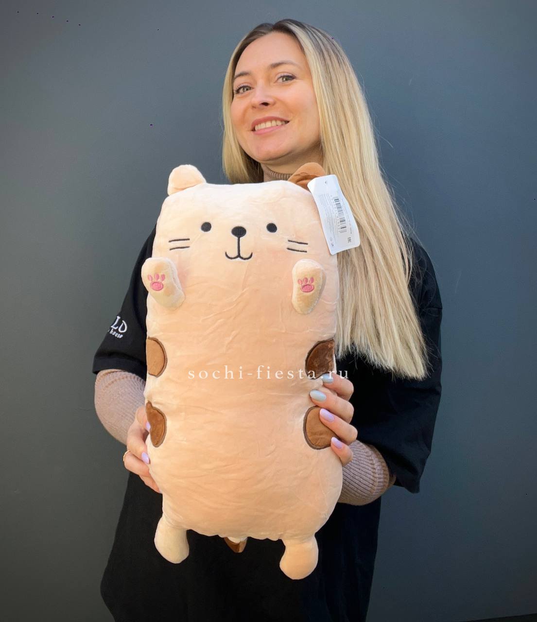 Кот пирожок лежит плоско и уютно помещается в руках или на коленях. Его округлая форма и мягкость располагают к тактильному контакту.