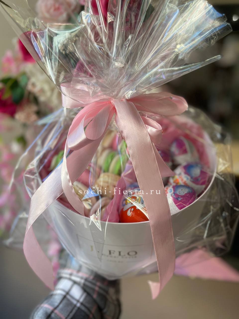 Двухуровневый бокс с макаронс и шоколадными конфетами в стильной упаковке. Сочетание хрустящего миндального печенья с кремовой начинкой и классического шоколада. Возможна замена сладостей по вашему желанию.