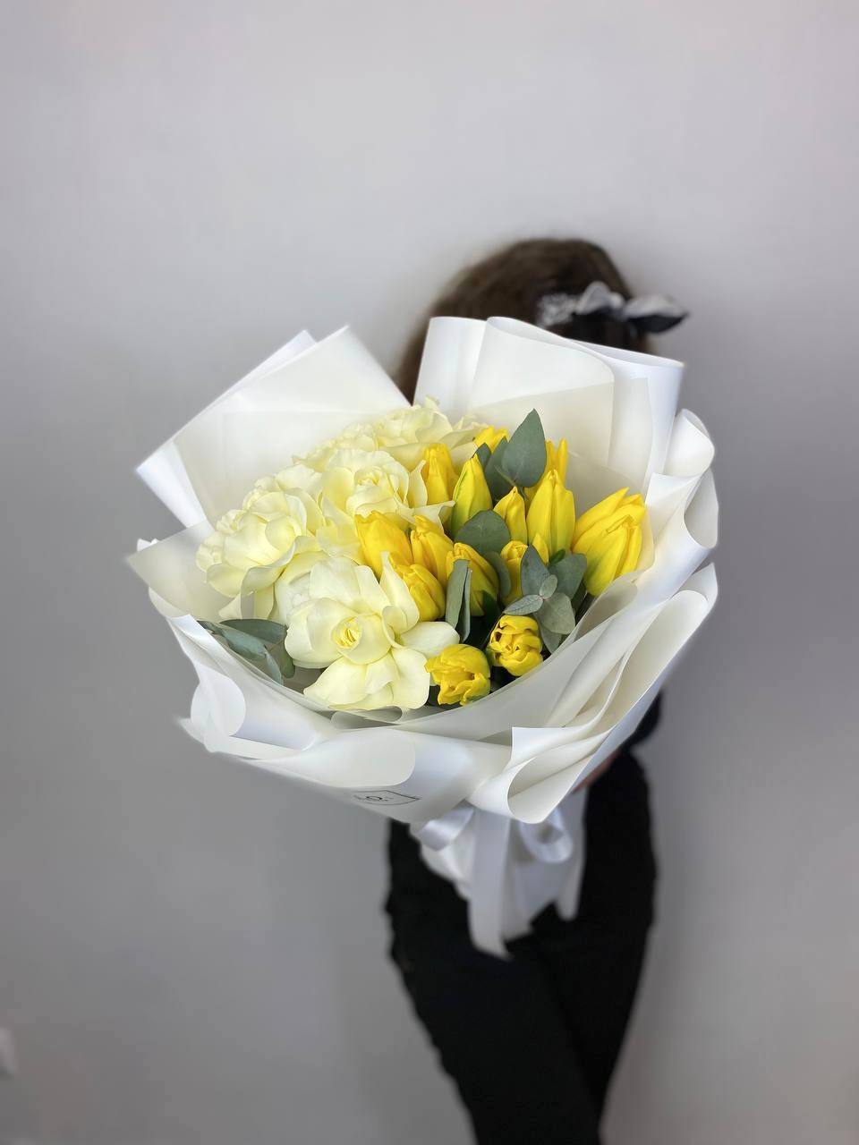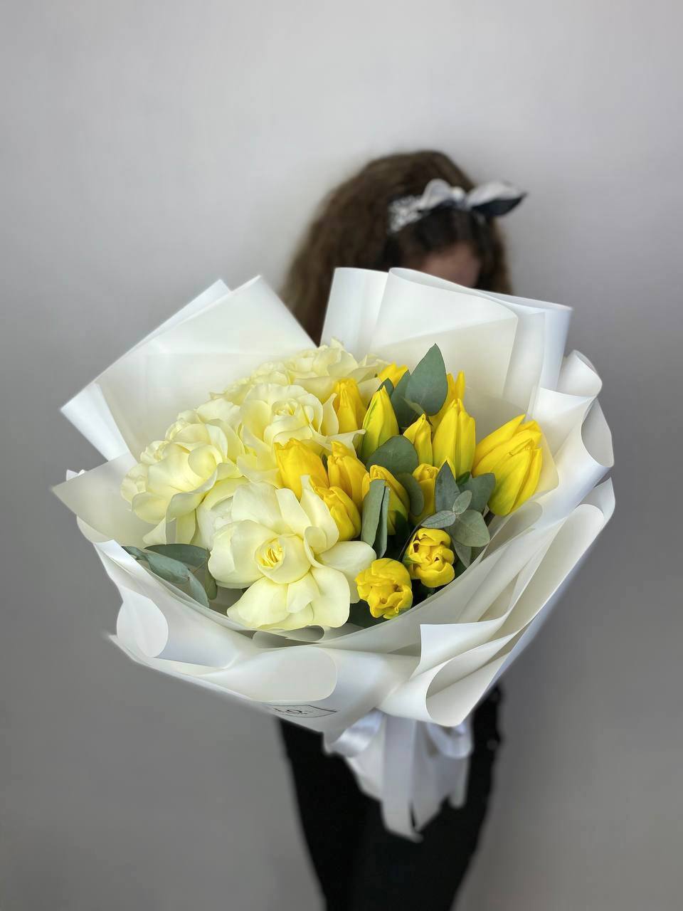 Солнечные тюльпаны переплетаются с розами в тёплой жёлтой гамме. Эвкалипт добавляет свежести и завершает композицию мягкими серебристыми нотами.
