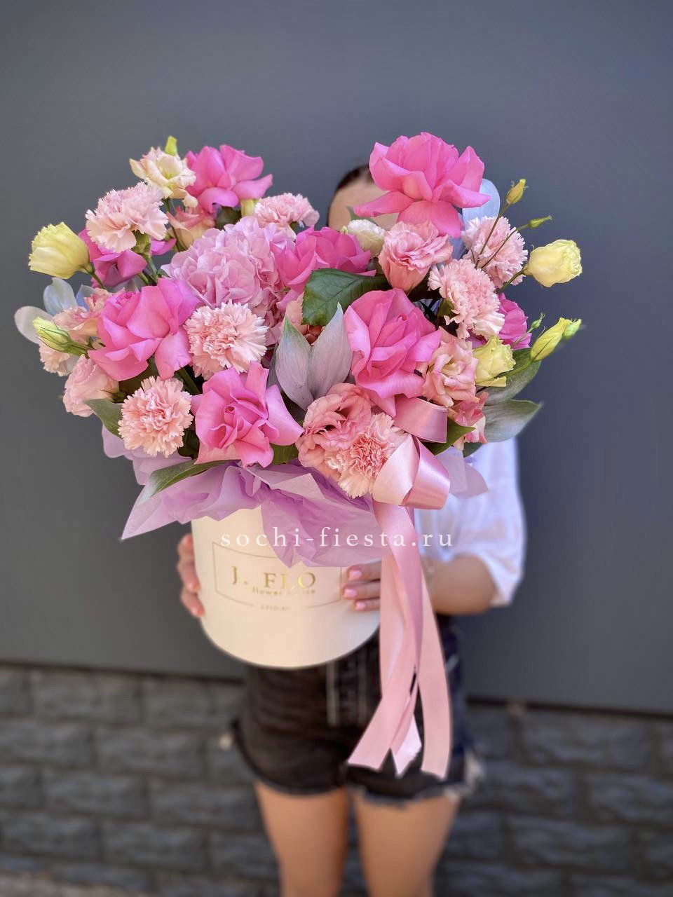 гортензия розовая, лента, дизайнерская упаковка. Цвет гортензий может незначительно отличаться.