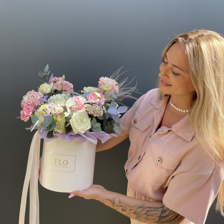 шляпная коробка с розами и хризантемами для студии флористики в Таганроге