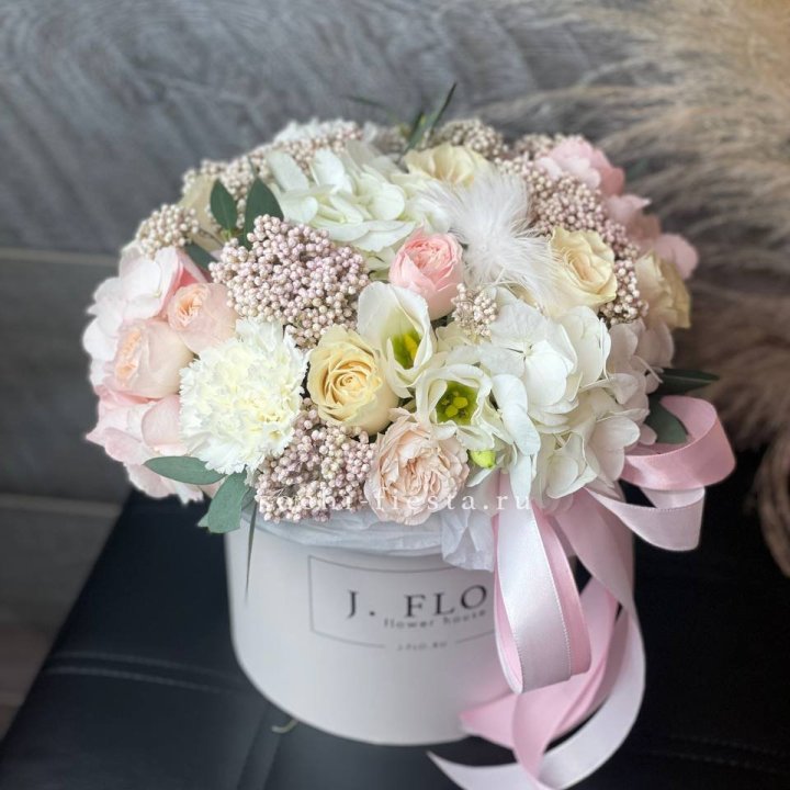 шляпная коробка с розами и хризантемами для студии флористики в Таганроге