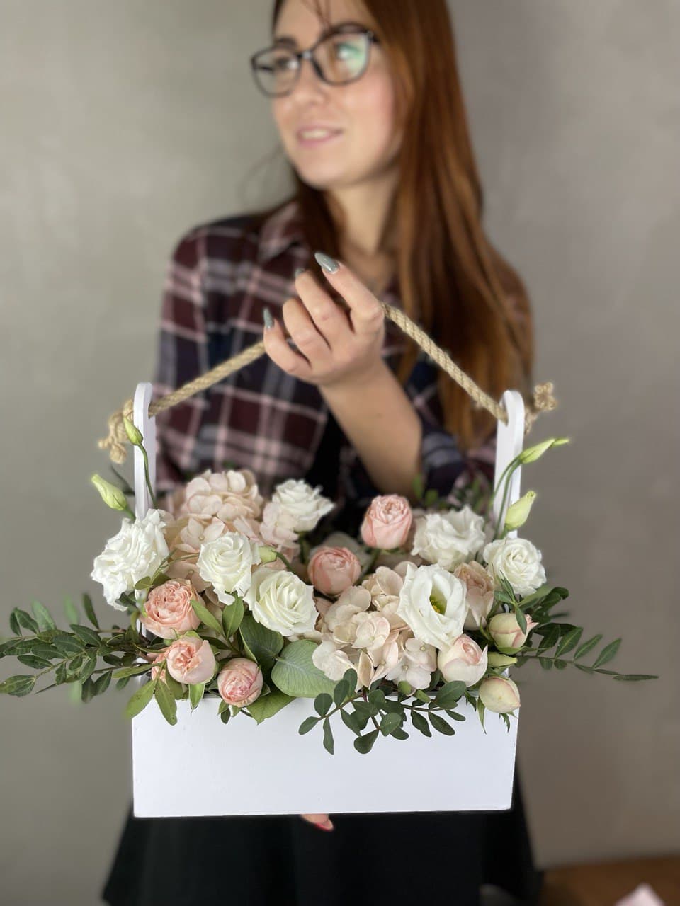 Деревянный ящик собрал в себе плотные бутоны кустовых роз, воздушную эустому и пышные соцветия гортензии. Зелень фисташки добавляет объём и завершает форму композиции.
