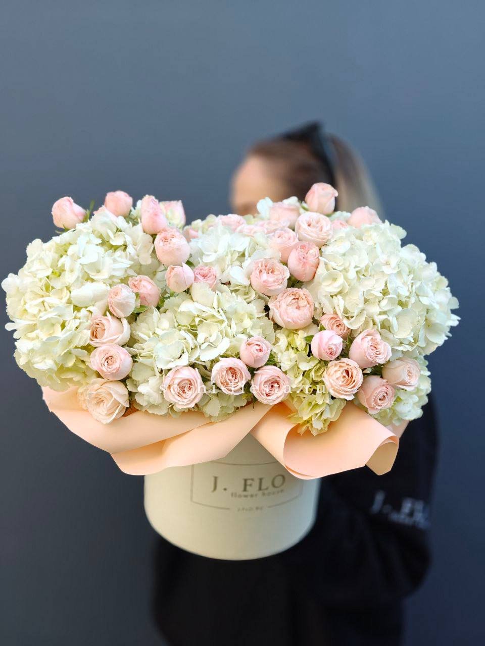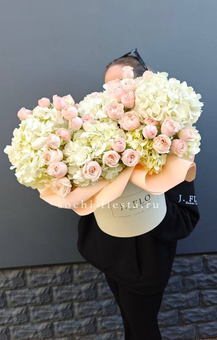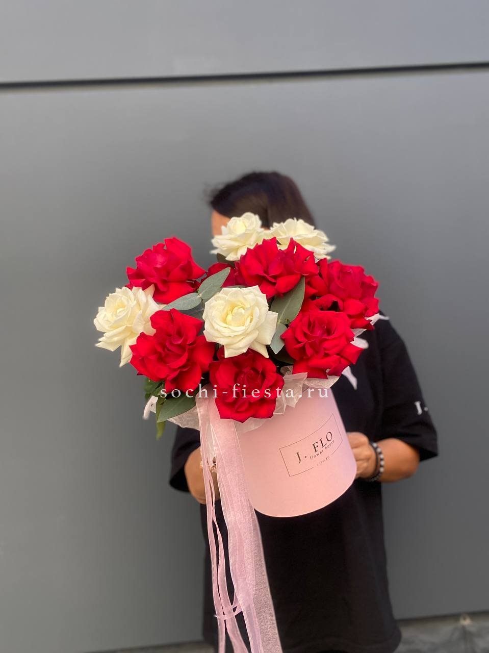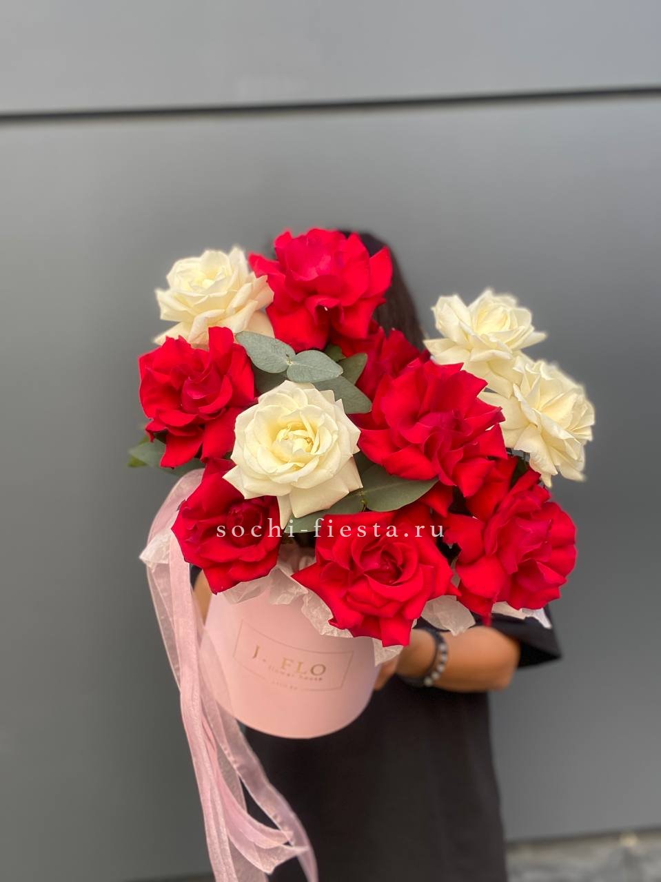 Двадцать семь бархатных роз собраны в плотную круглую композицию с серебристыми ветками эвкалипта. Шляпная коробка сохраняет свежесть и позволяет разместить цветы в любом уголке дома.