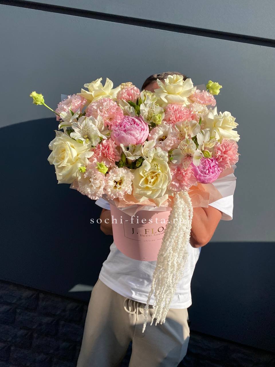 пионы, розы, эустома, диантусы, альстромерия, амарант, цилиндр D20, эвкалипт, лента, упаковка.