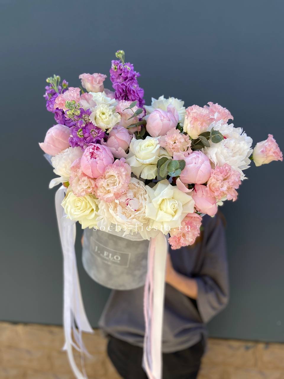 Пионы распускаются крупными шапками, а эустома и маттиола заполняют пространство воздушными соцветиями. Композиция собрана плотно, каждый бутон находит своё место в общем ритме.