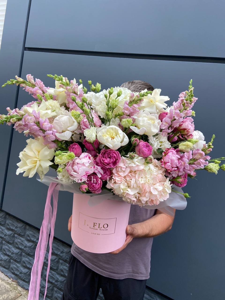 пионы, одноголовые розы, эустома, маттиола (аналог вне сезона), эвкалипт, мисти баблс, лента, цилиндр D20.