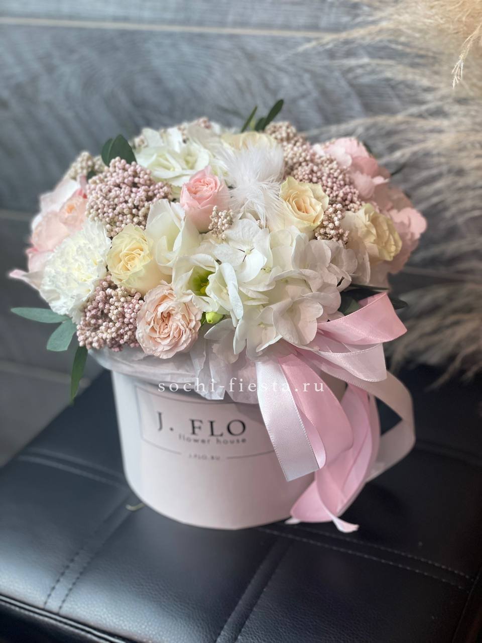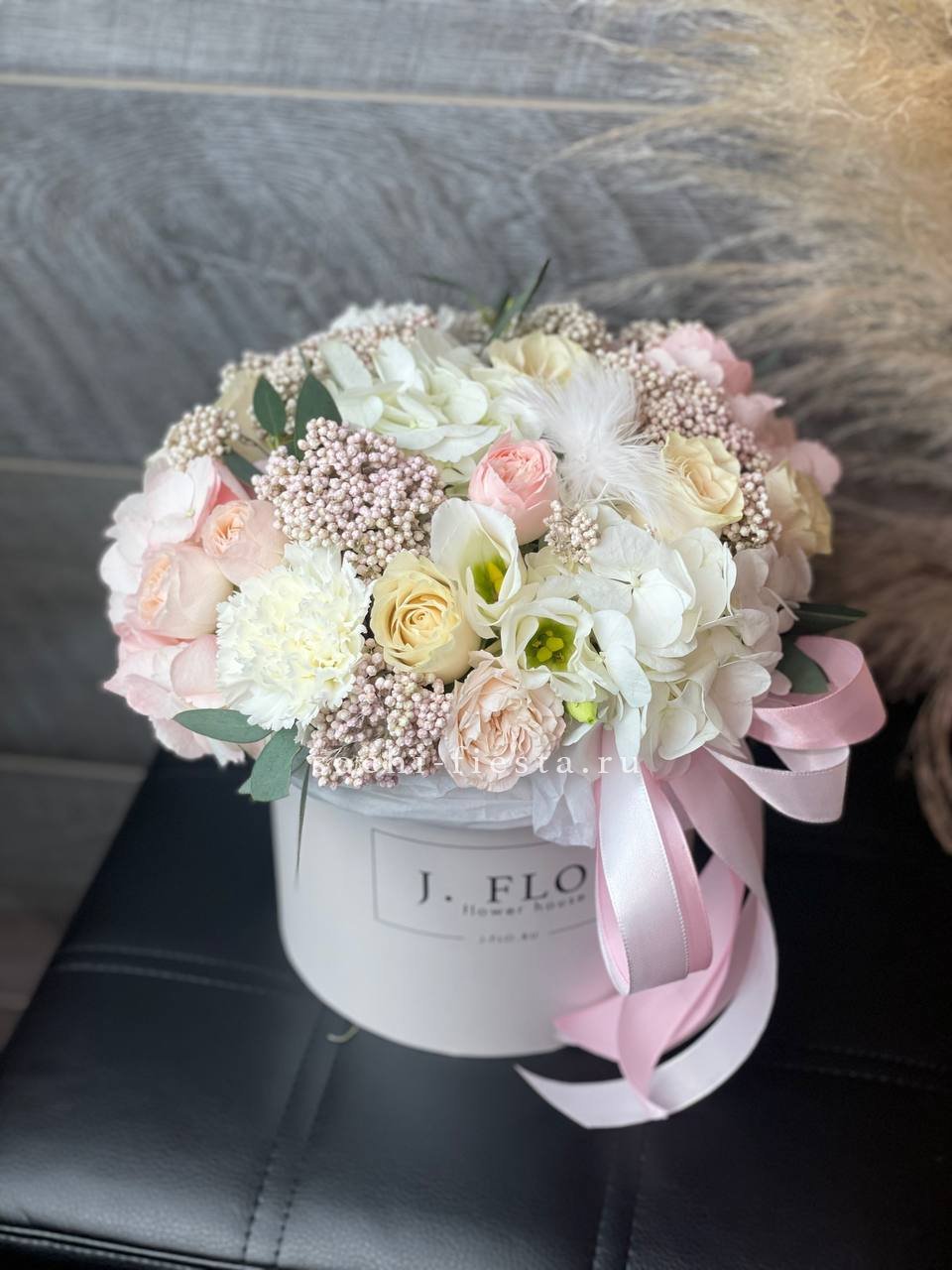 пионовидные кустовые розы, эвкалипт, лимониум, зелень, лента, цилиндр D16.