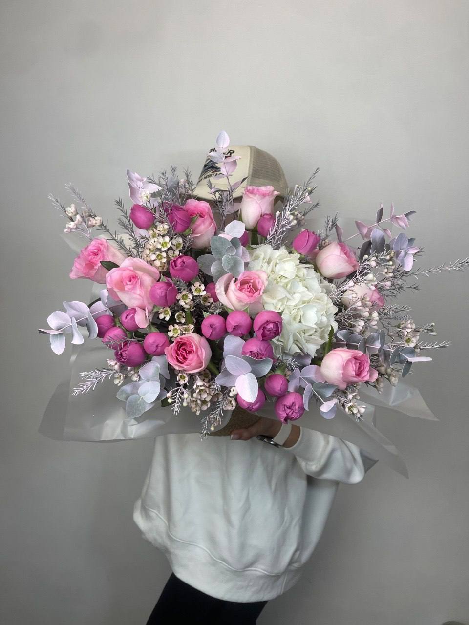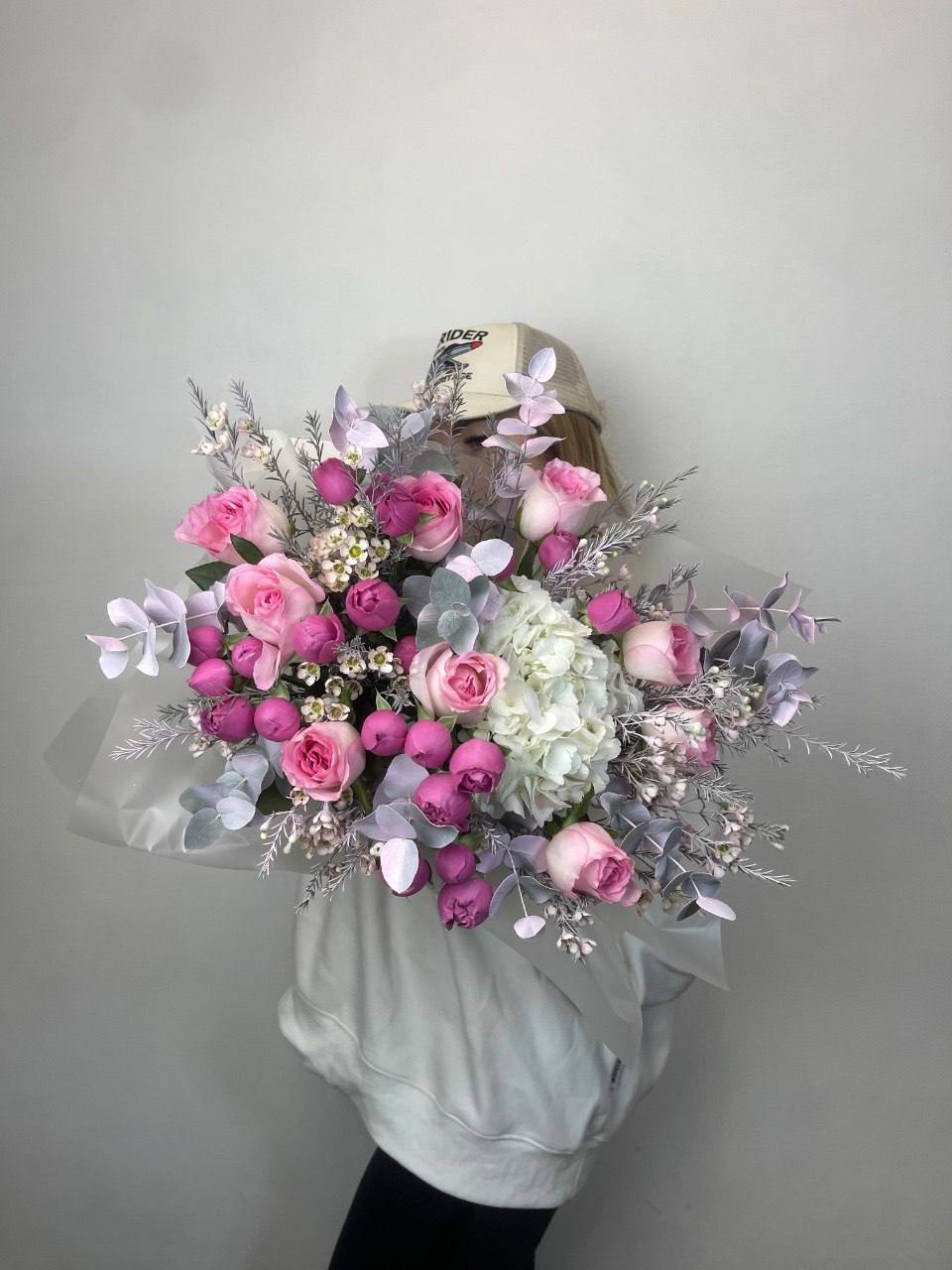 Белоснежные розы и воздушная гортензия создают объёмную композицию с мягкими переходами оттенков. Эустома и диантус добавляют фактурности, а лимониум заполняет пространство между крупными бутонами.