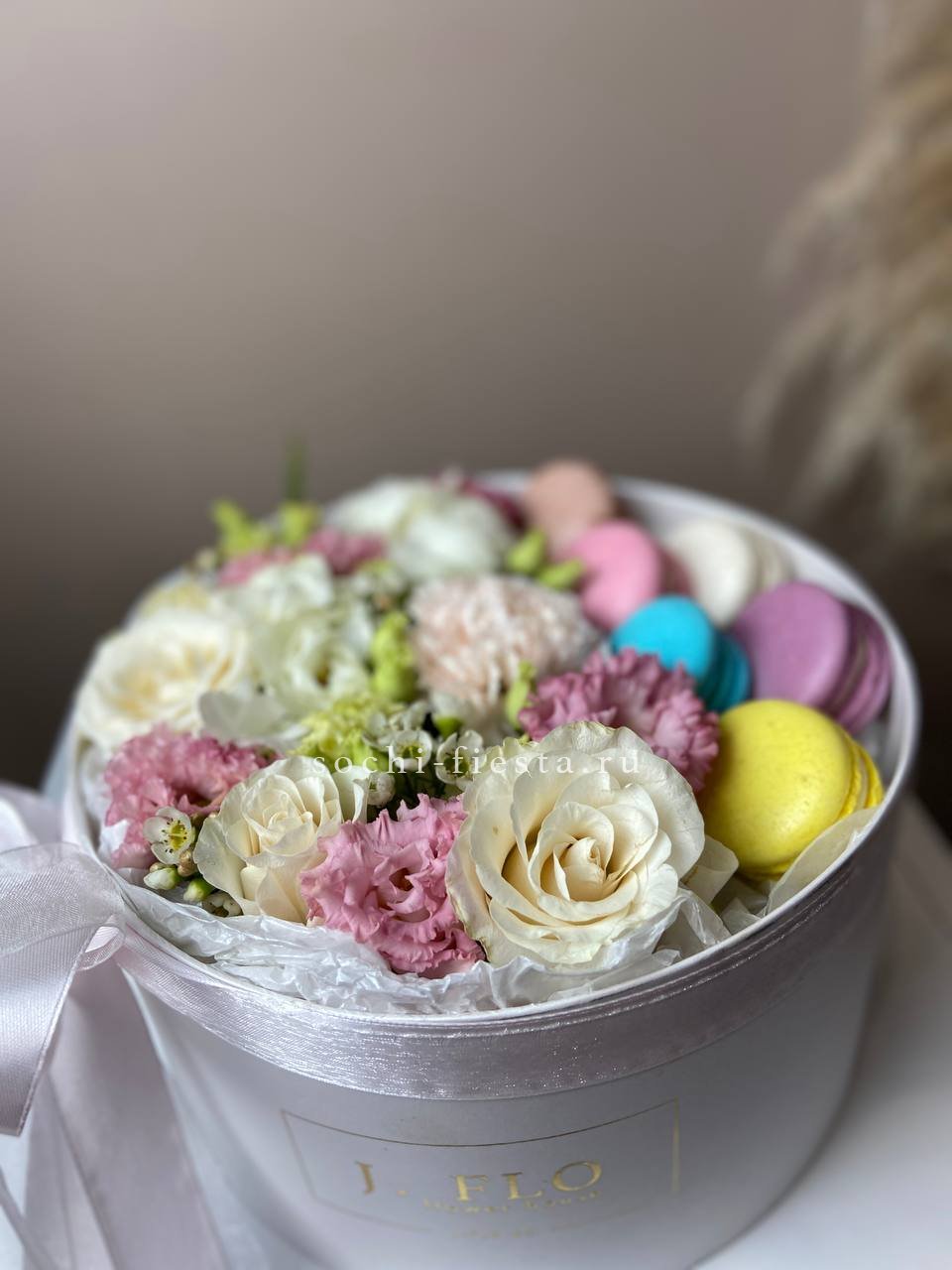 розы, диантусы в нежных оттенках, розовая круглая коробка D20, 6 макаронс.