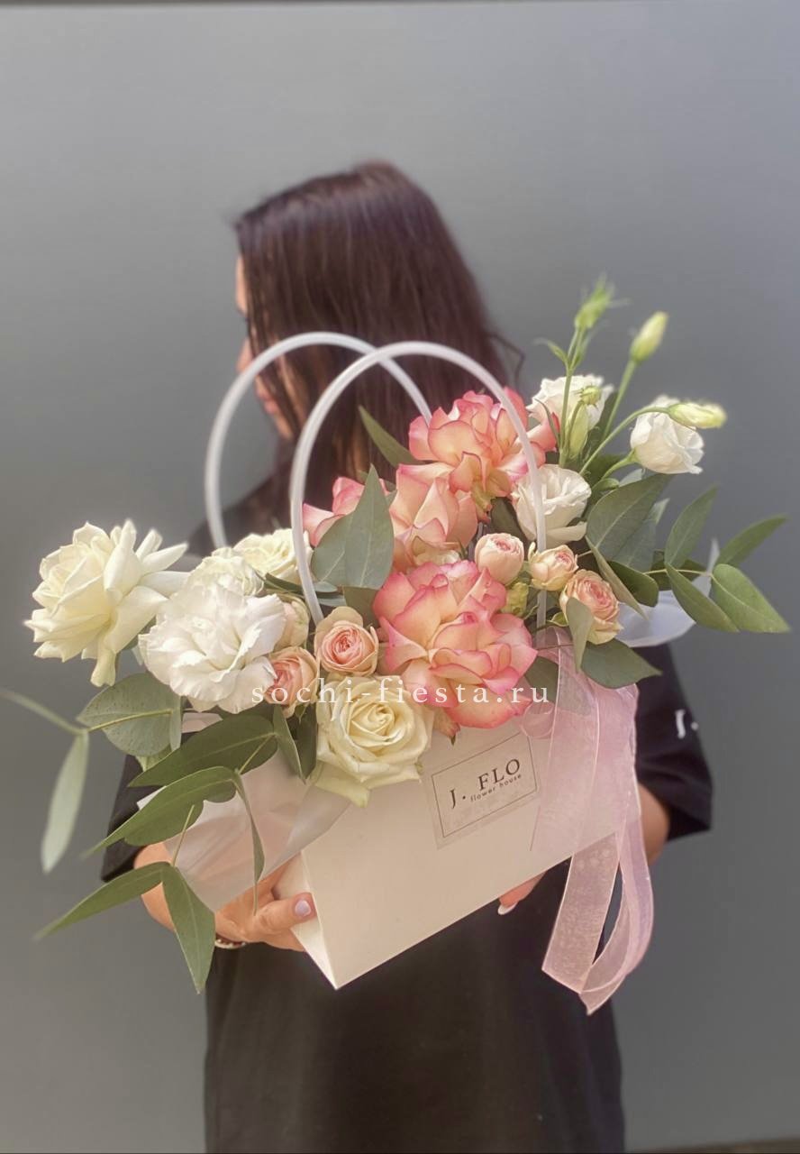 Розовые розы встречаются с орхидеей цимбидиум в объемной сумке-кашпо. Эустома и диантус создают многослойность, а кустовые розы заполняют пространство между крупными бутонами. Композиция держит форму и радует насыщенностью.