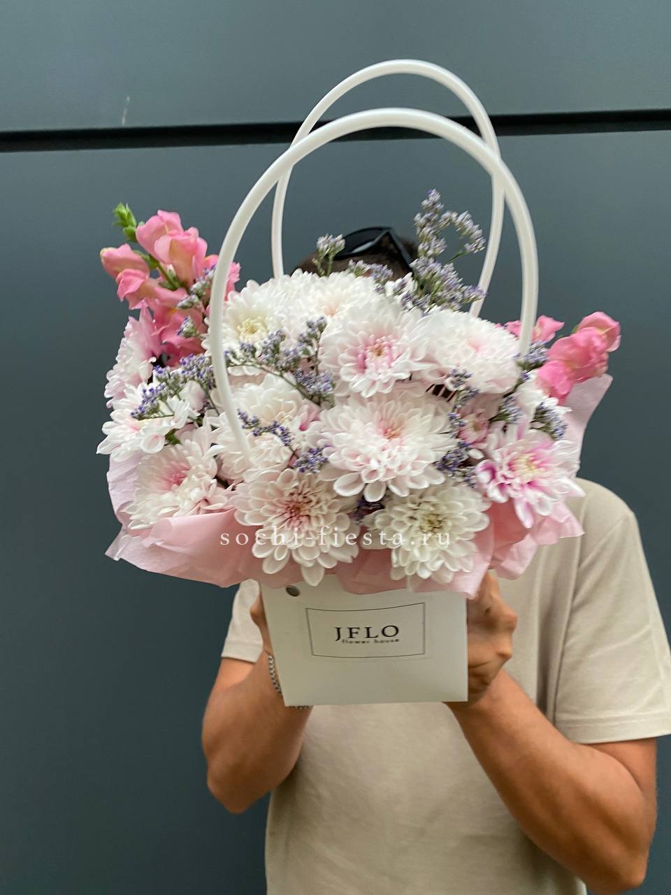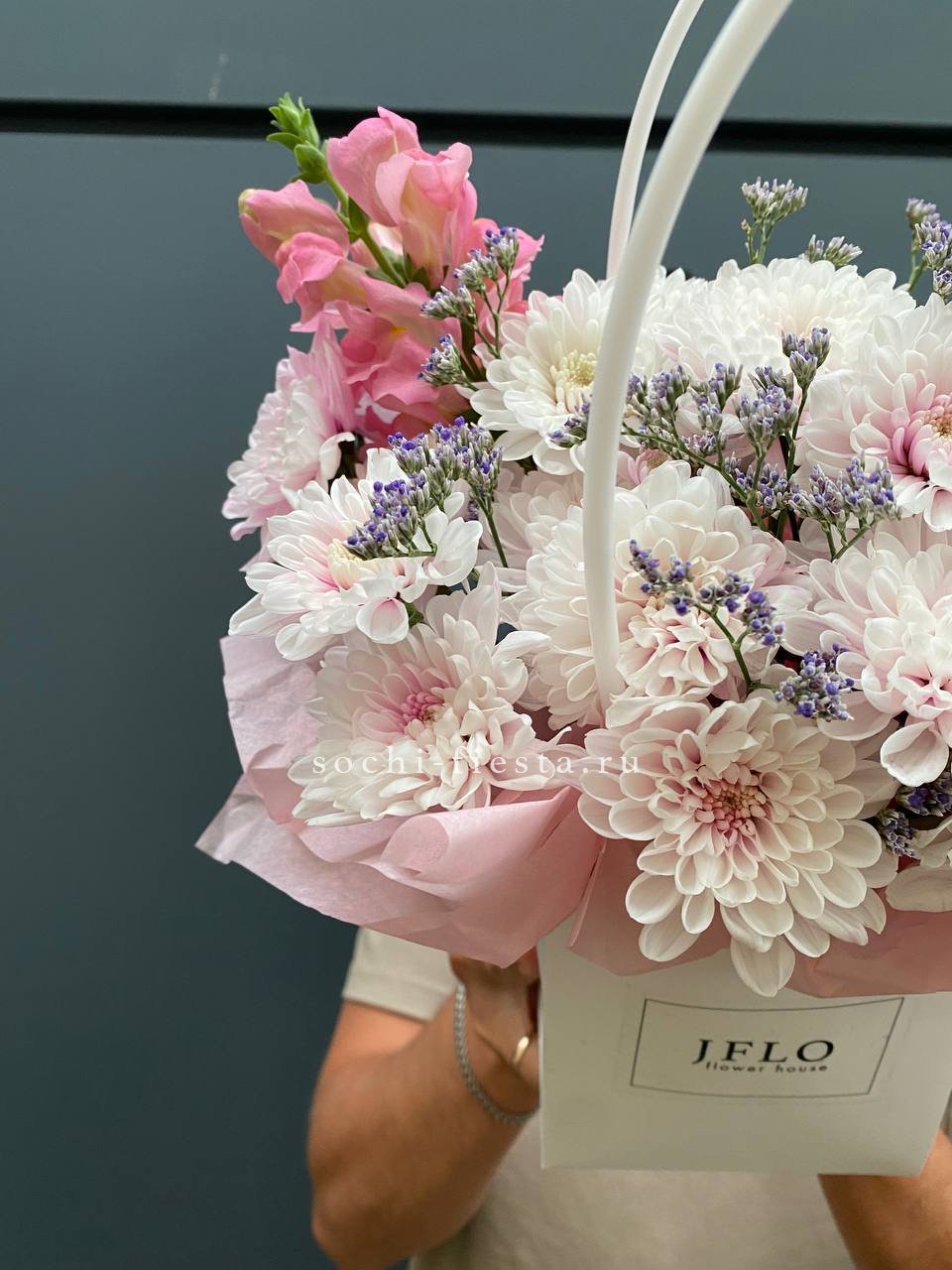Белые и розовые розы образуют воздушную композицию с мягкими коробочками хлопка и лимониумом. Сумка-кашпо Sofi держит форму и позволяет разместить цветы на столе или полке. Букет выглядит аккуратно и остается свежим долгое время.