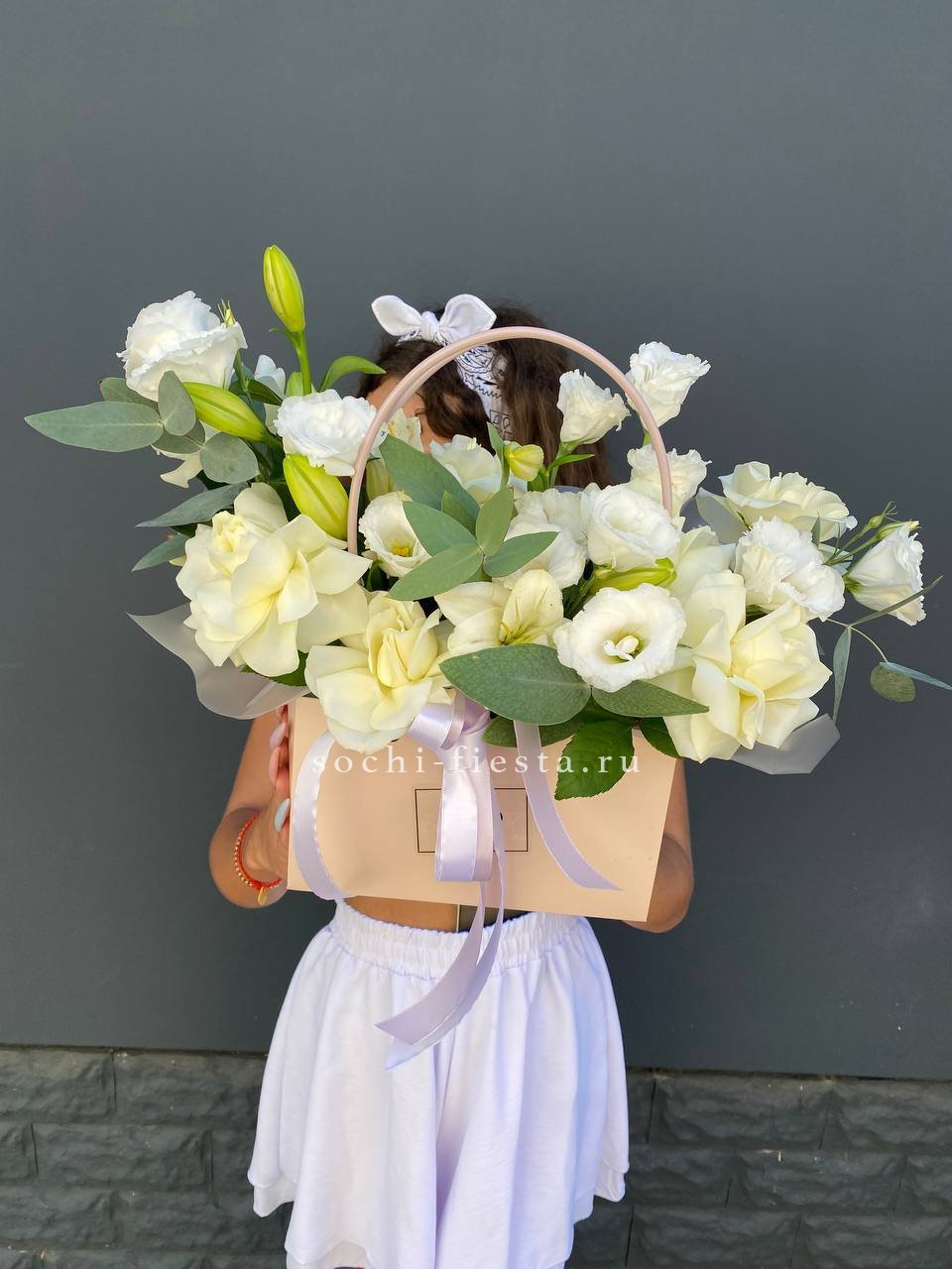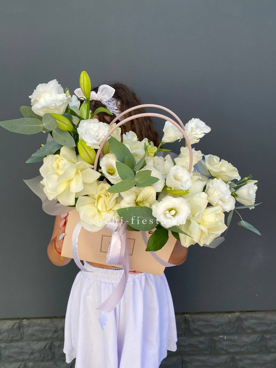 Гортензия и джумилия соседствуют с герберой в удобной сумочке. Разная плотность бутонов создает живую игру объемов и переходов от воздушного к плотному.