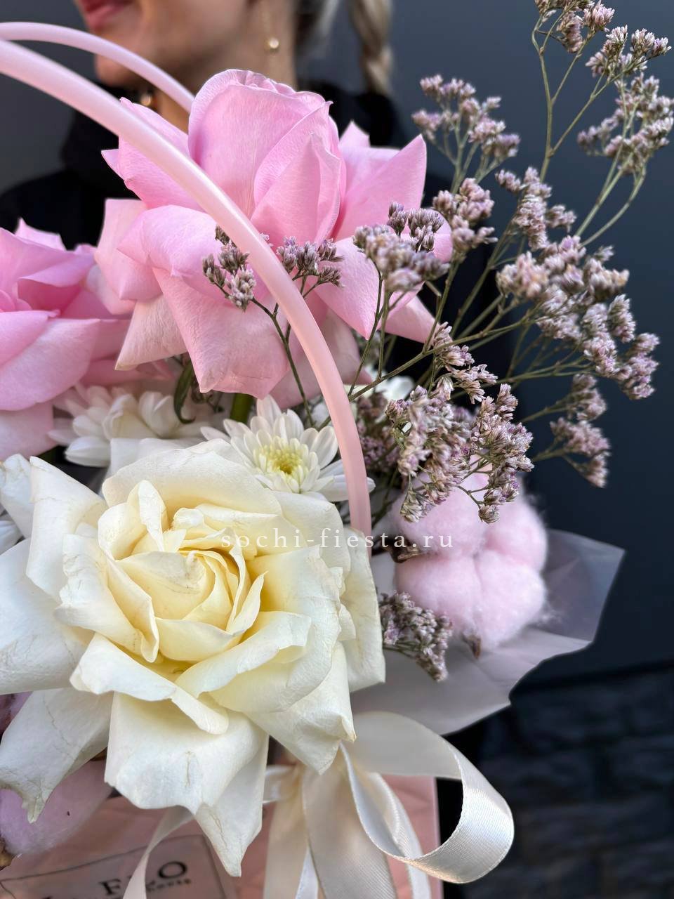 Компактная сумочка с кустовыми хризантемами создаёт уютное настроение. Живые соцветия собраны в удобной форме, которая легко размещается на столе или полке.