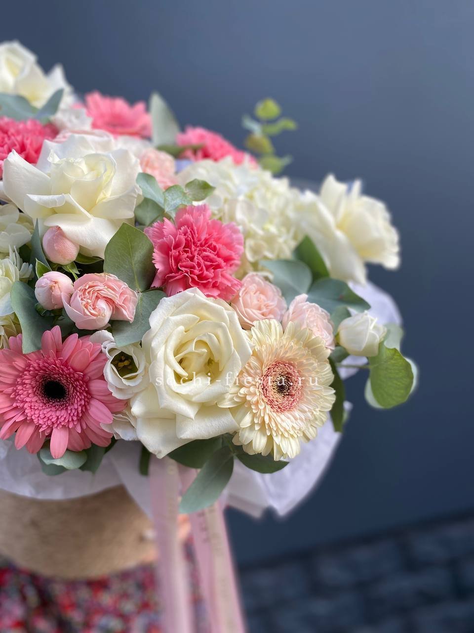 Этот букет создан, чтобы заряжать позитивом! Яркие акценты розовых гербер и теплые оттенки кремовых роз, в обрамлении свежей зелени, создают ощущение солнечного дня и беззаботного счастья. Это не просто цветы, а концентрат радости, который мгновенно поднимет настроение и добавит ярких красок в жизнь.