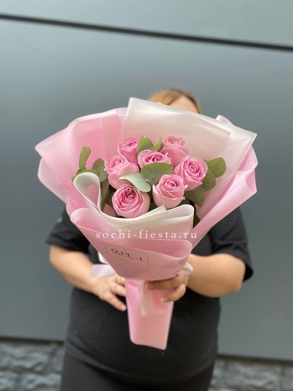 Состав выполнен из пионовидных роз мисти, хлопка, эвкалипта, оформления. Данная цена доступна при единовременном заказе от 10 шт.