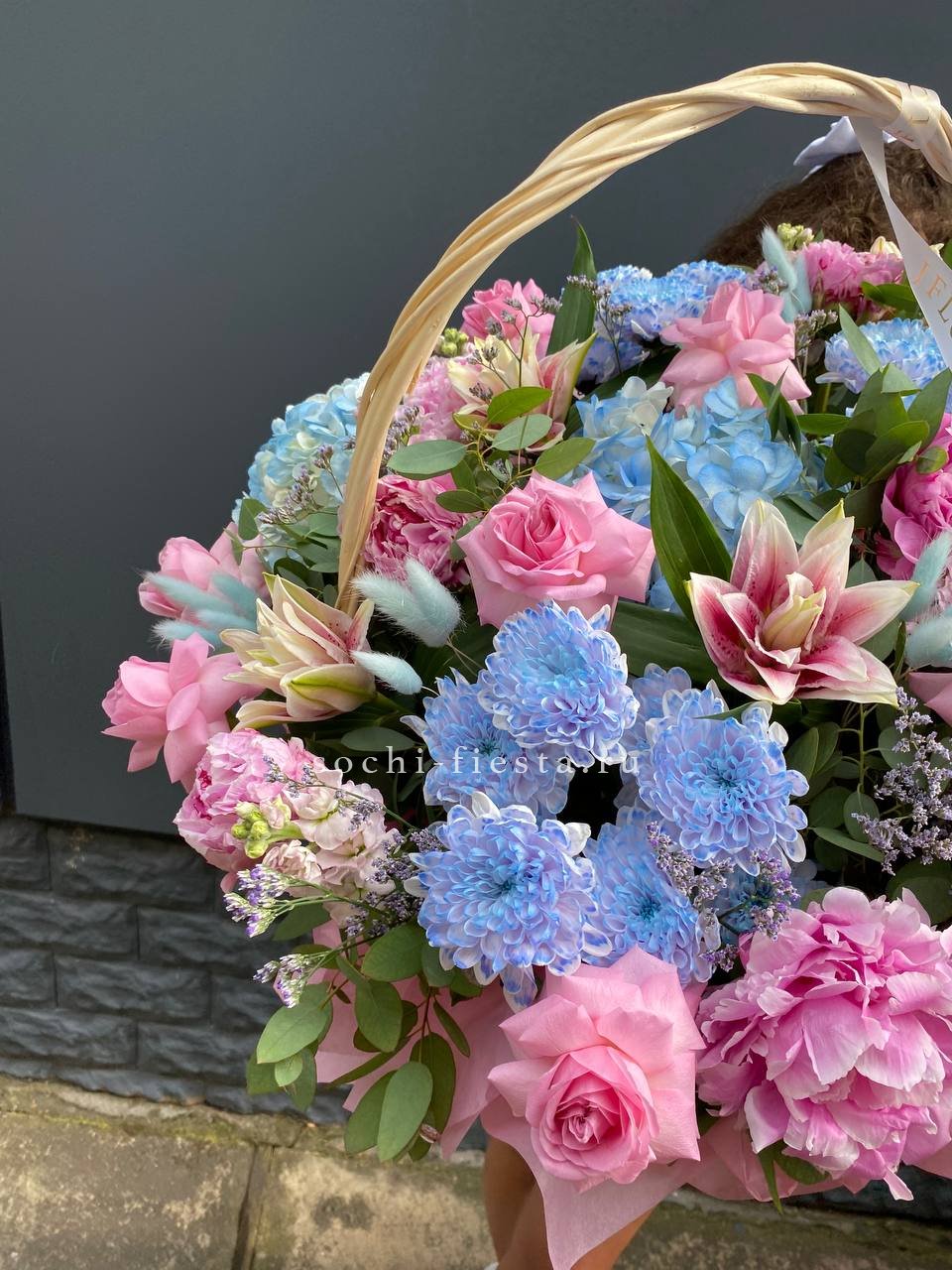 Пышная корзина объединяет летнее буйство красок: насыщенные гортензии, распустившиеся лилии, яркие хризантемы и пионы с матовым лимониумом. Композиция создает ощущение солнечного дня, наполненного светом и теплом.