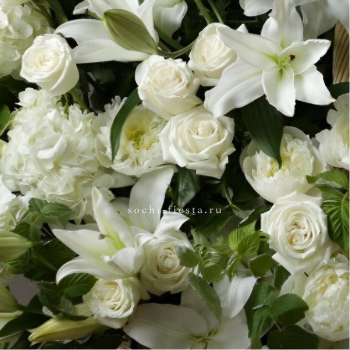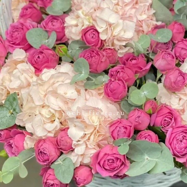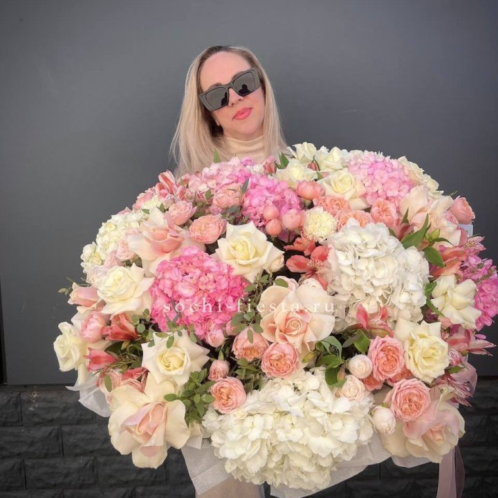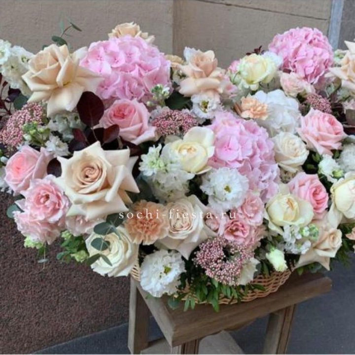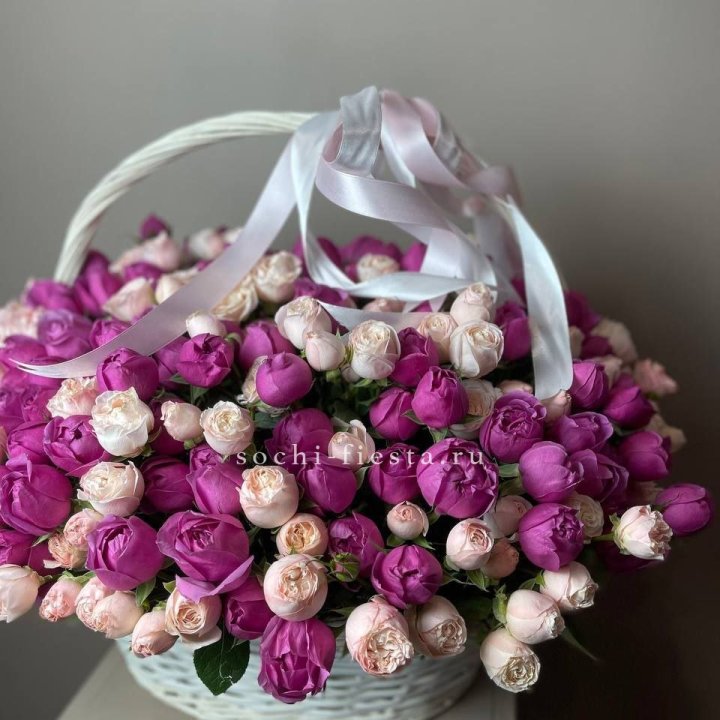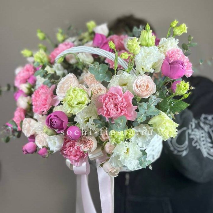 Состав корзин в Таганроге определяется текущими поставками и сезоном. Розы Freedom, Mondial, Cappuccino — для классических куполообразных аранжировок. Пионы в мае-июне из свежих поставок: Sarah Bernhardt, Red Charm, Bowl of Cream — главный сезонный продукт. Хризантема, альстромерия, гербера — для объёмных торжественных наполнений. Эустома, ранункули — для садовых корзин. Флорист строит состав под конкретный запрос.
