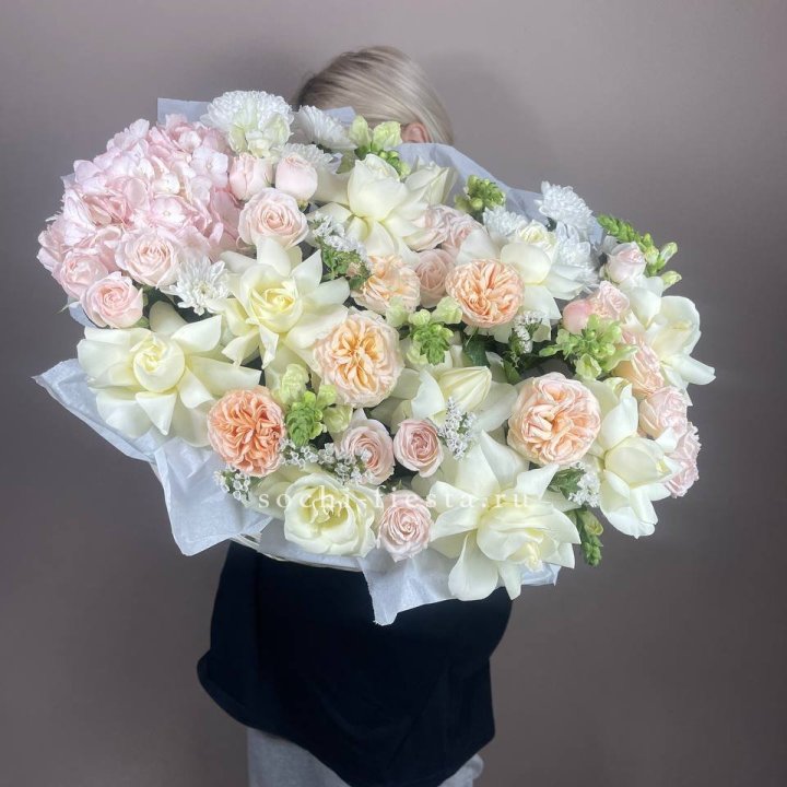 Каждый сезон приносит в Таганроге свой ассортимент корзин. Весной флорист создаёт корзины с тюльпанами и нарциссами — лёгкие, нежные, полные ощущения обновления. В мае-июне приходят пионы — Sarah Bernhardt, Bowl of Cream, Red Charm — главный флористический праздник. Осенью — хризантема в тёплых гаммах с декоративными ягодами и ветвями. Зимой — хвойные аранжировки с амариллисом для праздничной атмосферы.