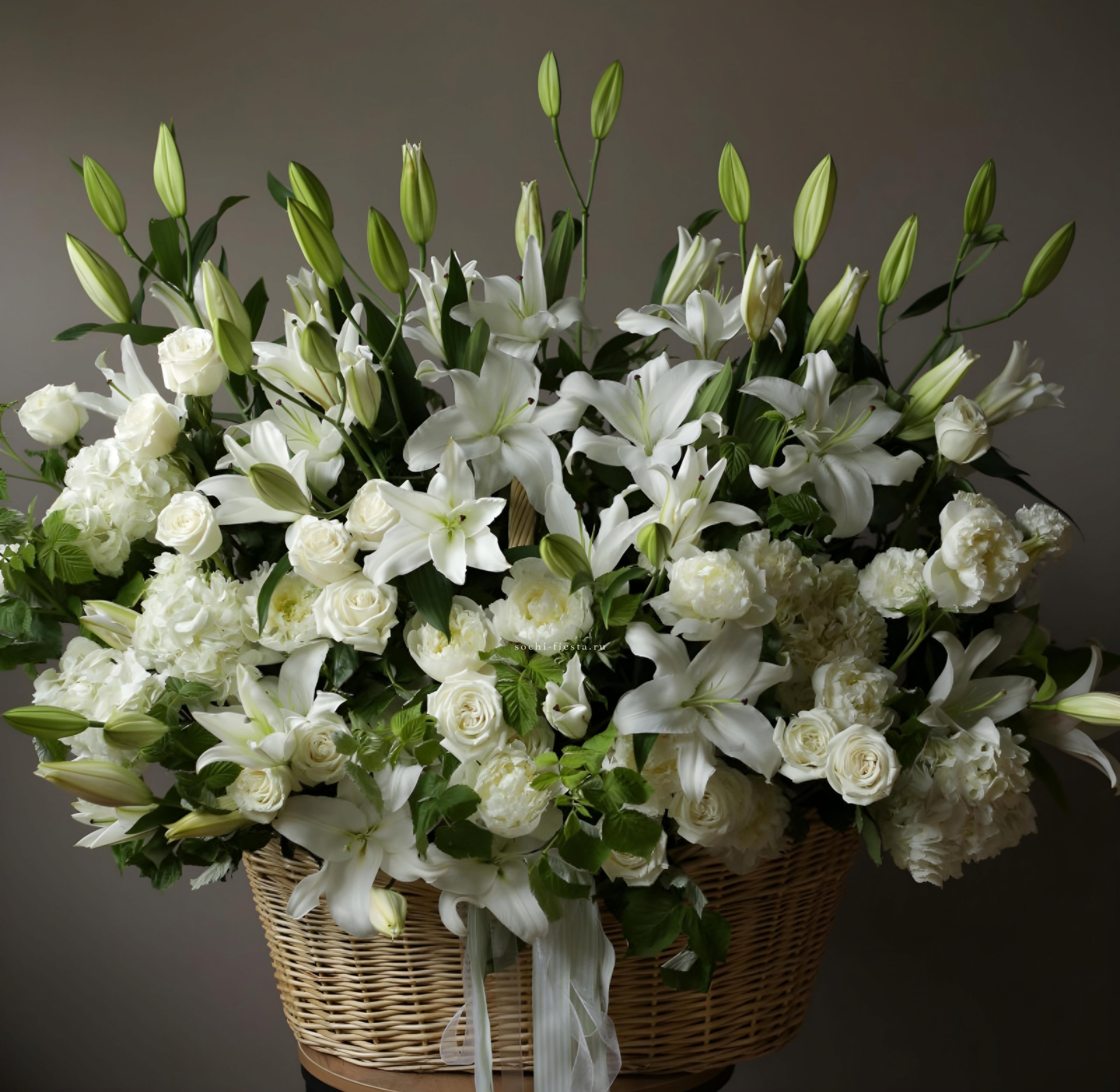 Корзина объединяет гортензии, эустомы, розы и маттиолу в многослойную композицию. Разные фактуры лепестков создают визуальную глубину и насыщенность.