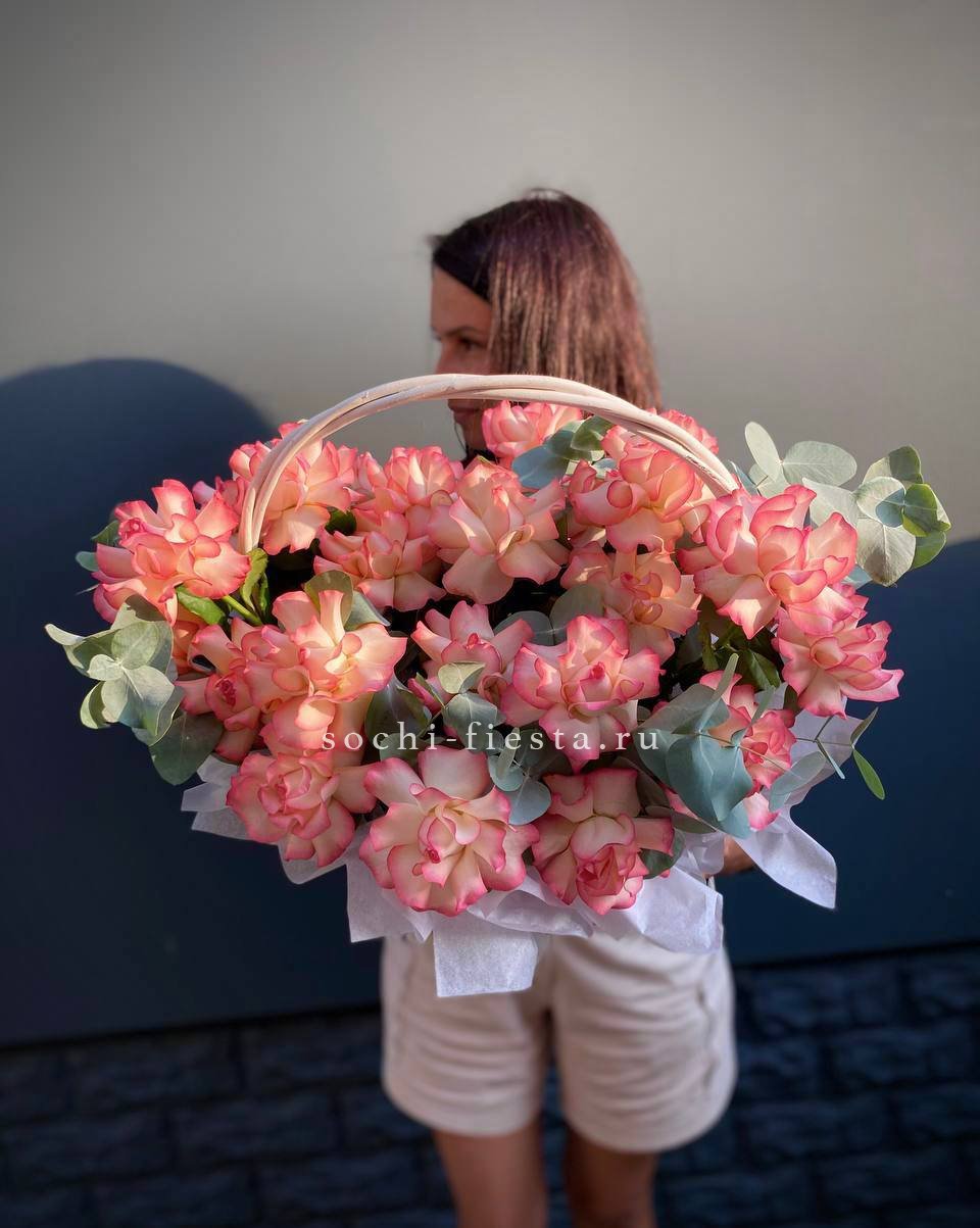 гортензия, эустома, розы, маттиола (дельфиниум или аналоги), кустовые розы, лента, корзина D40.