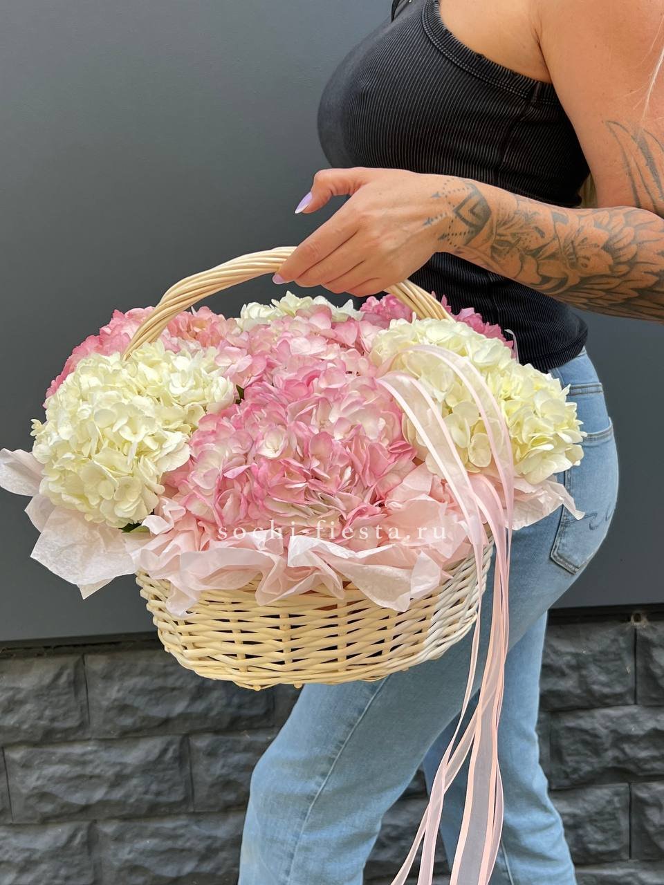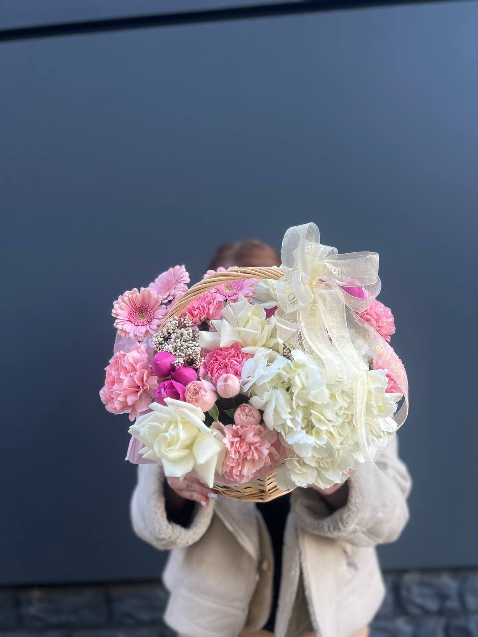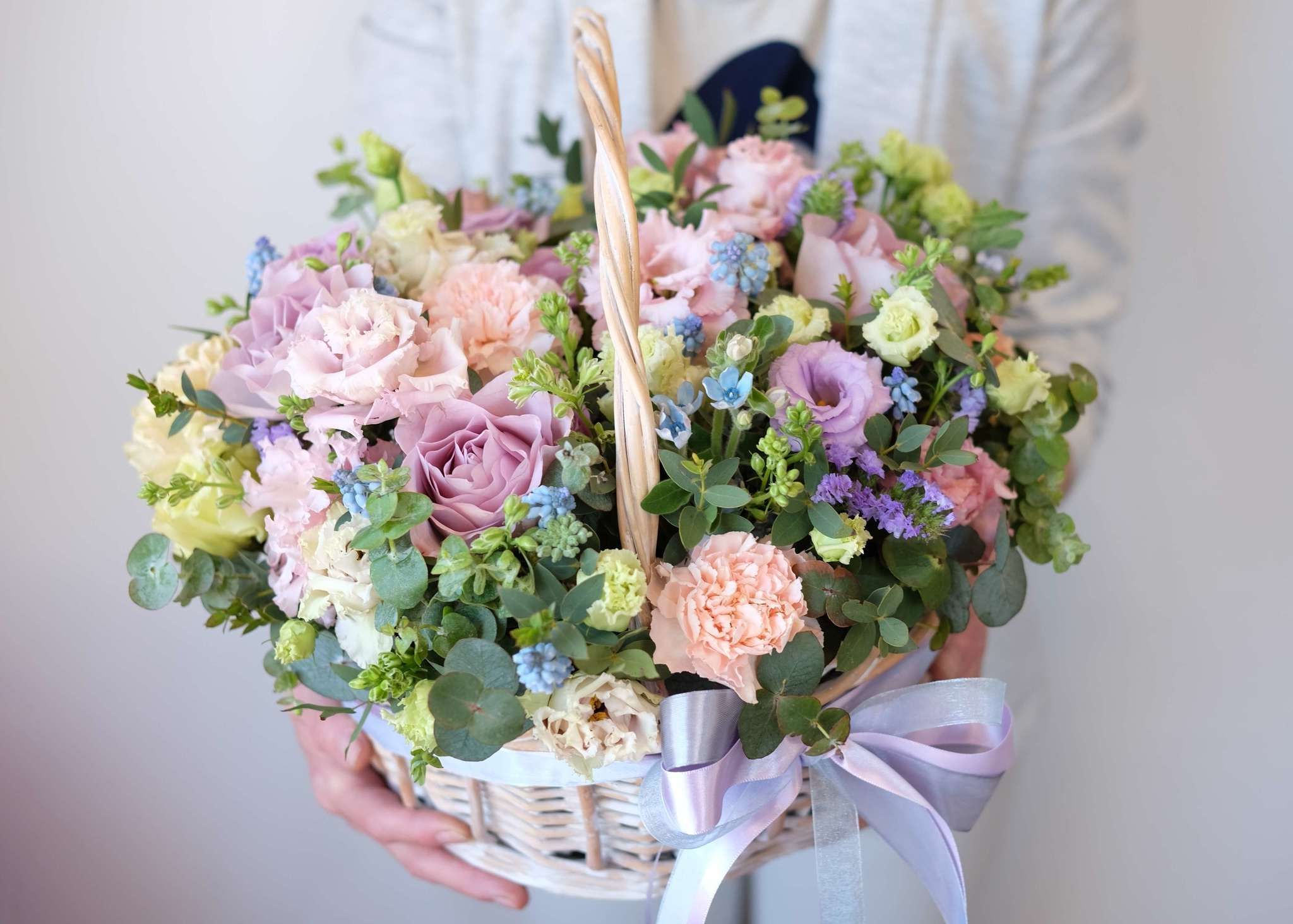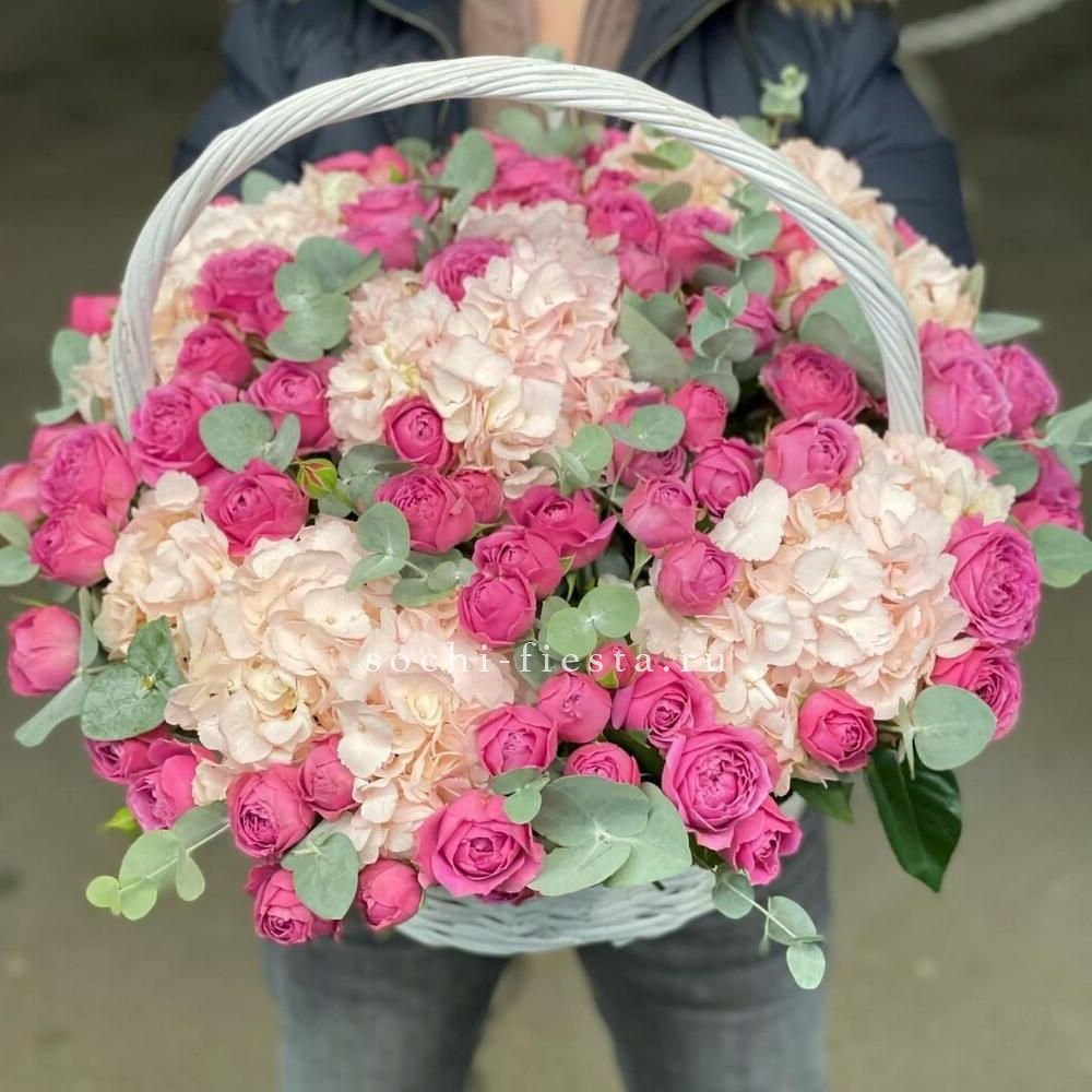 розы, эустома, гортензия, бомбастик, маттиола ( или аналог), эвкалипт, корзина.