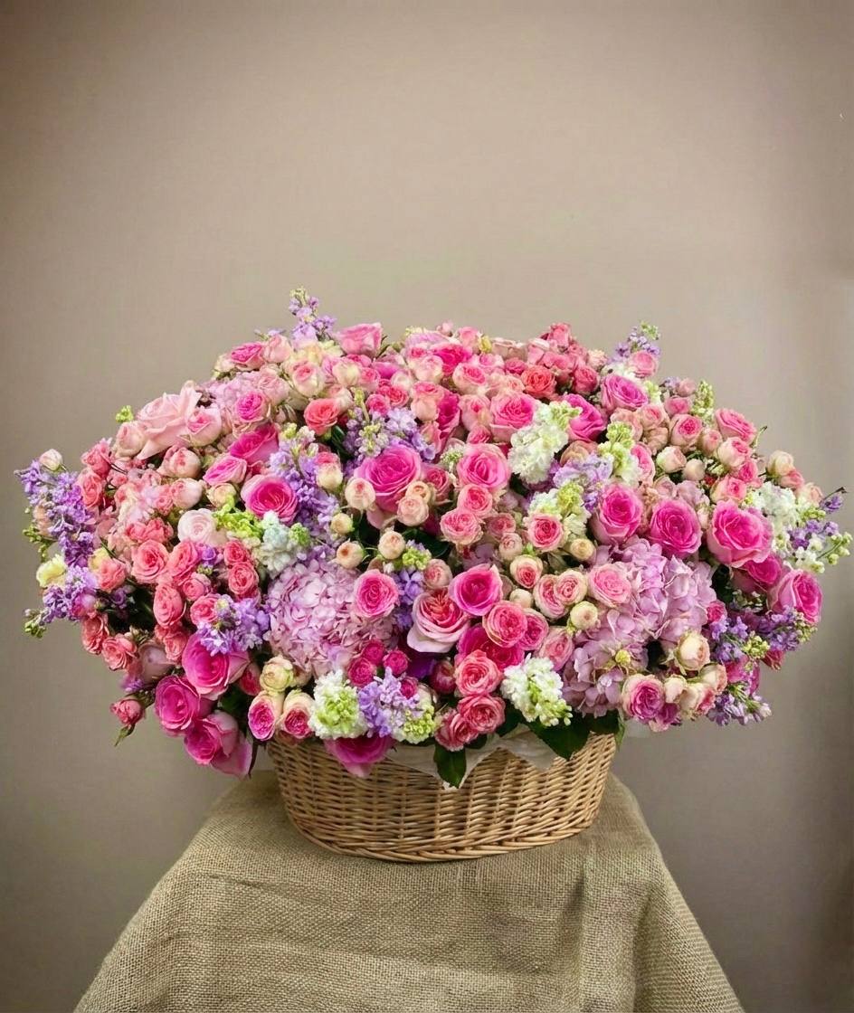 Пышная корзина с розами и гортензиями собрана плотно и объёмно. Маттиола добавляет живую текстуру между крупными соцветиями, а кустовые розы заполняют композицию мягкими переходами. Результат — впечатляющее присутствие, которое меняет восприятие пространства.