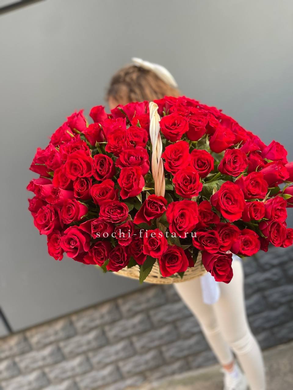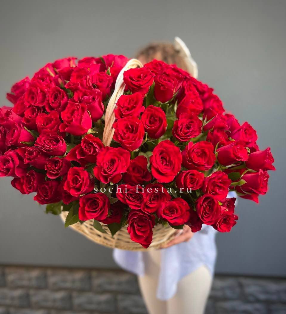 розы одноголовые, розы кустовые, эустома, фисташка или эвкалипт, пиафлор, лента, корзина D35.