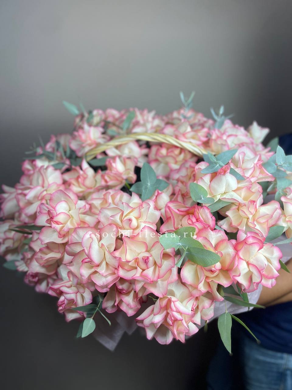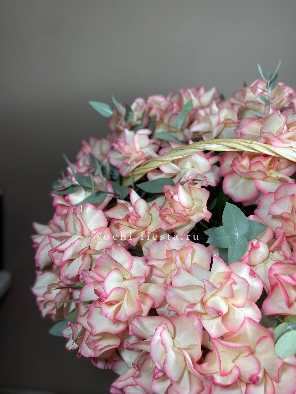 роза одноголовая, роза пионовидная, альстромерия, эустома, гортензия, ковыль, диантус, плетеная корзина.